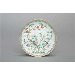 Chinese, Kuang Hsu mark and of the period, Famille Rose enameled and gilt, porcelain dish with well-detailed flowering branch design interior, ruyi and floral band on rim and floral spray exterior (minor wear to gilt), late 19th Century; D: 8 1/2"