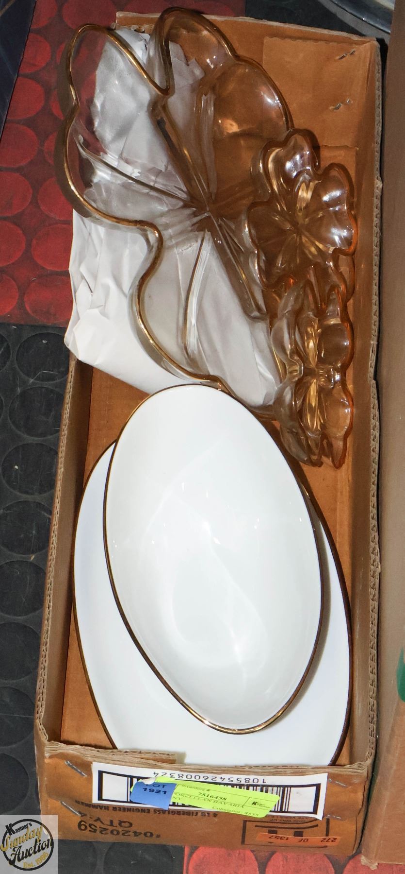 GOLD TRIMMED DISH + 5PC 4 LEAF CLOVER GLASS DISHWARE COLLECTION **ALL ITEMS MUST BE REMOVED BY 5PM SATURDAY, JUNE 28th 2025. ALL REMAINING ITEMS WILL BE SUBJECT TO A $6.00 PER DAY STORAGE CHARGE. ANY ITEMS REMAINING AFTER MONDAY, JULY 14TH 2025 WILL BE CONSIDERED FORFEITED. NO REFUNDS WILL BE ISSUED FOR FORFEITED ITEMS. TO SCHEDULE A PICK UP APPOINTMENT CLICK HERE