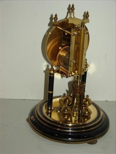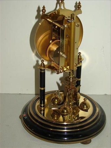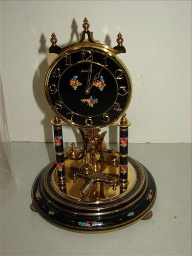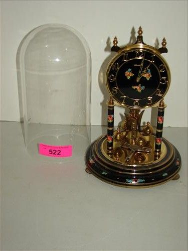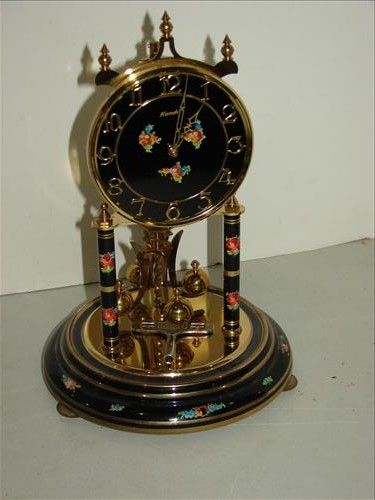 KUNDO ANNIVERSARY CLOCK. BLACK AND GOLD-TONED WITH FLORAL DESIGN. AS SHOWN. VIEW PICTURE FOR DETAIL.