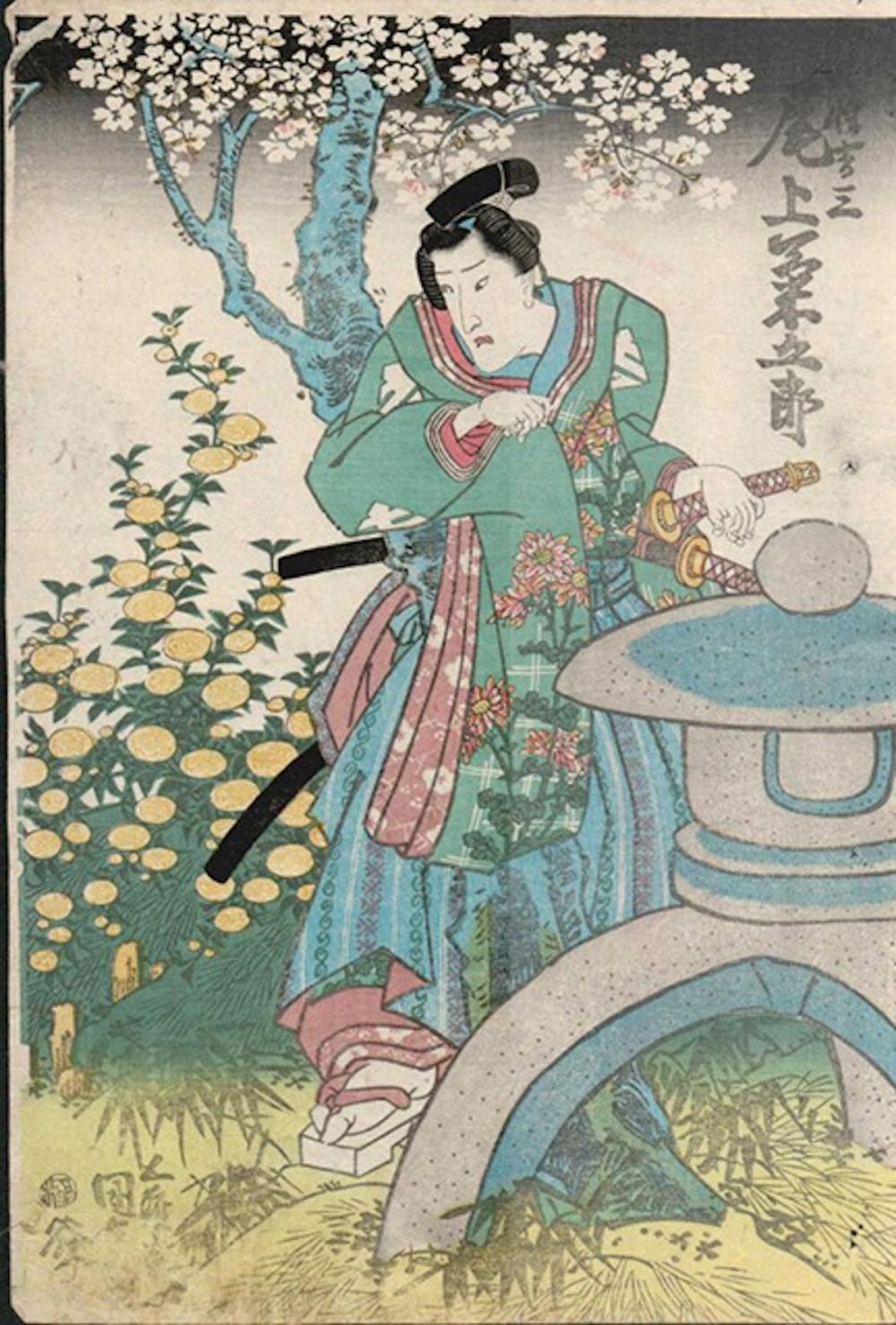 KUNISADA ACTORS. OBAN TATE-E, TRIPTYCH, EACH SHEET ~14 3/4 X 10, CIRCA 1838, VERY GOOD COLOR, IMPRESSION AND CONDITION, SLIGHTLY RUBBED LOWER LEFT CORNER