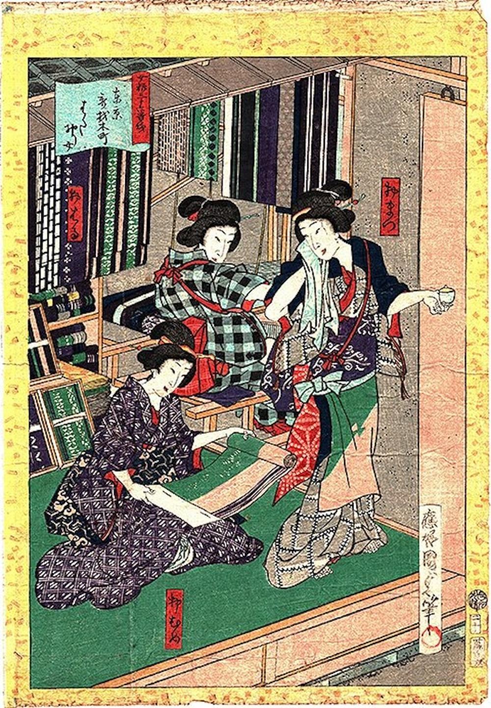 KUNISADA II TEXTILE (KIMONO) SHOP. OBAN TATE-E, 14 1/4 X 9 7/8, CIRCA 1860, GOOD CONDITION, VERY SLIGHT RUBBING foxing on the margin