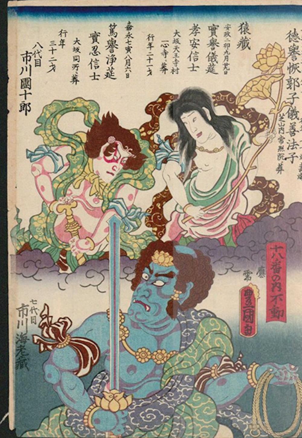 A.K.A. TOYOKUNI III , BUDDHIST SCENE , OBAN TATE-E. 14 3/4 X 10 , CIRCA 1850 , VERY FINE CONDITION