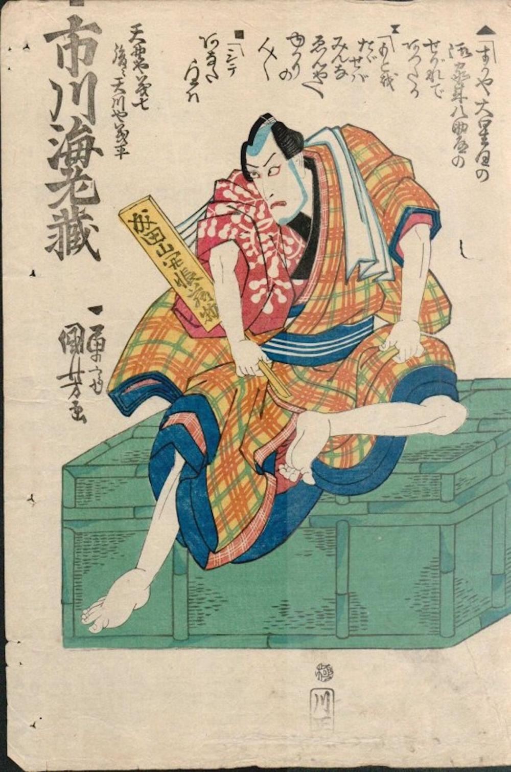 KUNIYOSHI - KABUKI ACTOR, OBAN TATE-E, 143/4 X 10", CIRCA 1828, FINE COLOR, IMPRESSION, VERY SLIGHTLY SOILED NEAR BOTTOM. BINDING HOLES.