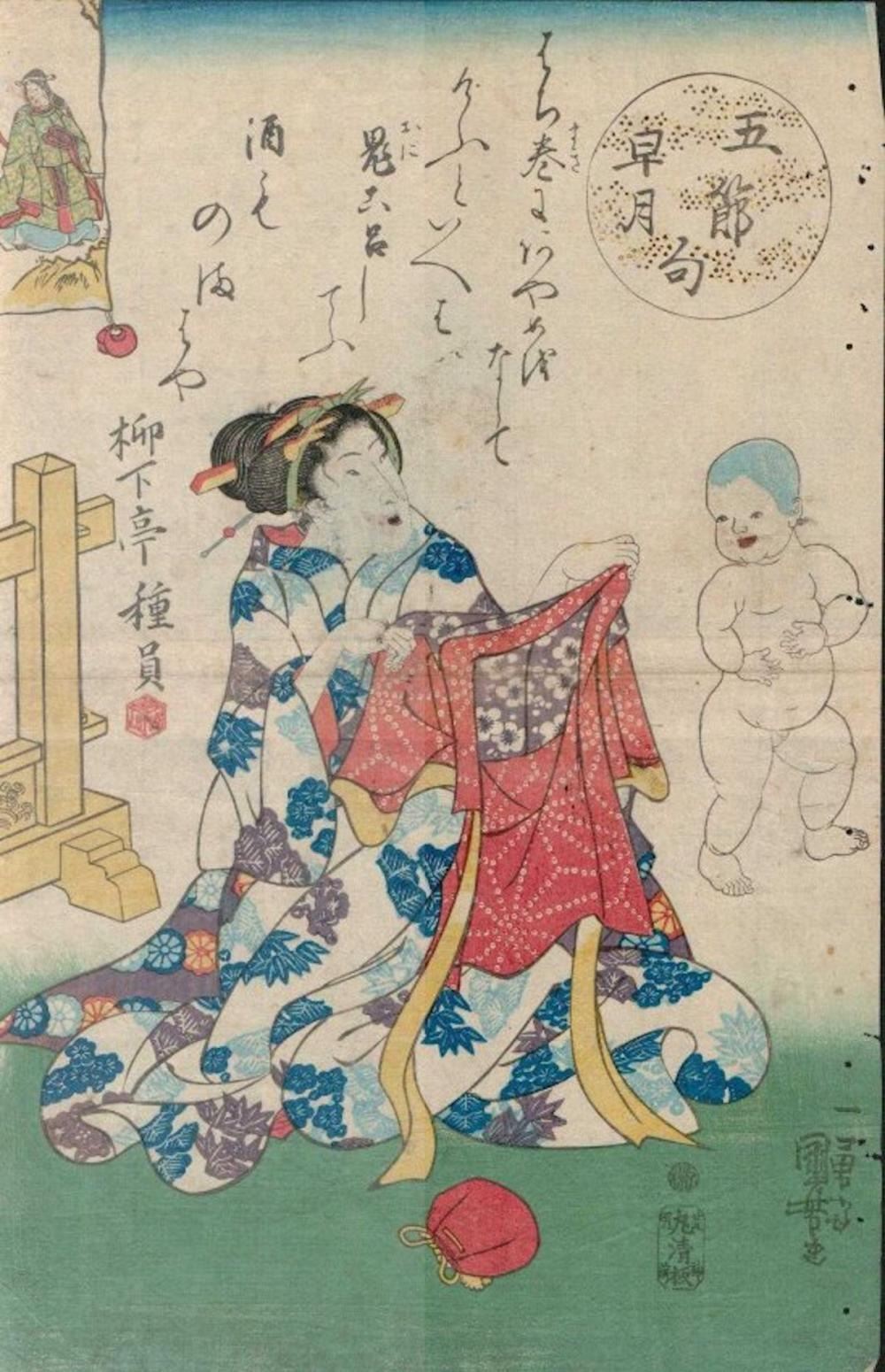 KUNIYOSHI: MOTHER AND HER SON. OBAN, TATE-E. CIRCA 1850. VERY GOOD COLOR, CENTERFOLD, TRIMMED, BINDING HOLES, SOILED, RUBBED