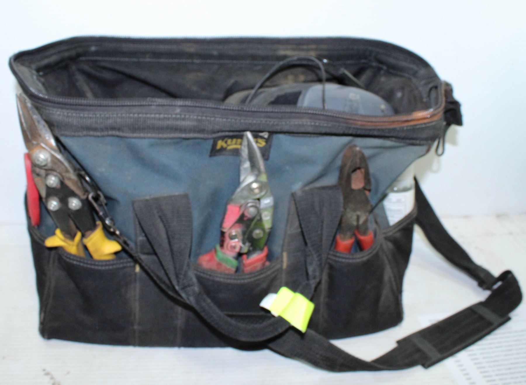 BAG WITH HANDLES , ZIPPER AND SHOULDER STRAP - FULL OF TOOLS INCL. CUTTERS, SNIPS, PLIERS, TAPES, SCREWDRIVERS, ETC.