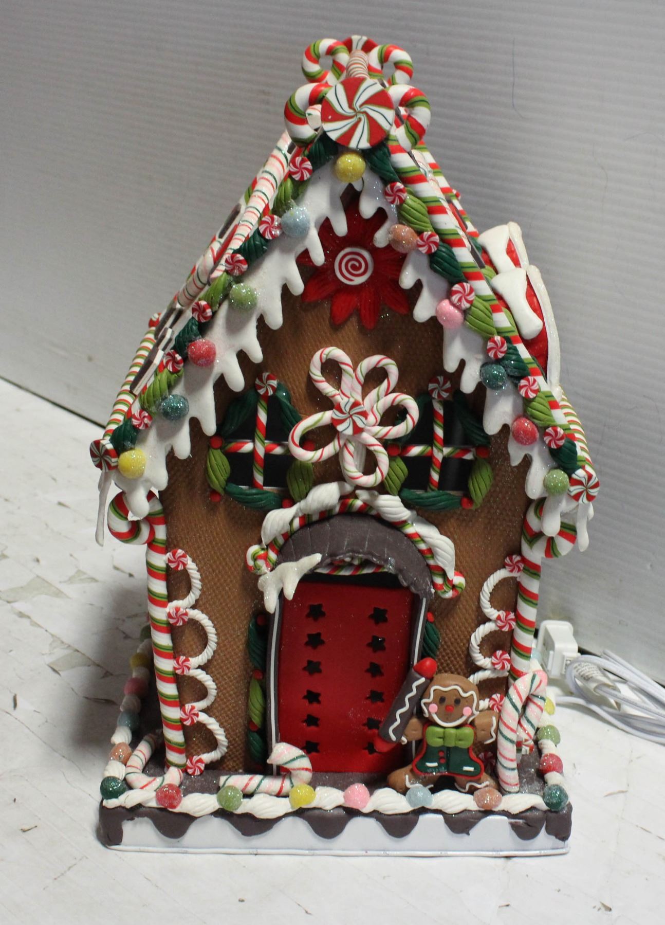 CANDY LIGHTED HOUSE LIGHTS UP DOOR, 8 WINDOWS & 2 DORM-STYLE WINDOWS, 13.25" H X 8.25" W X 8.25" D, TESTED & WORKS, CORD IS 5' LONG