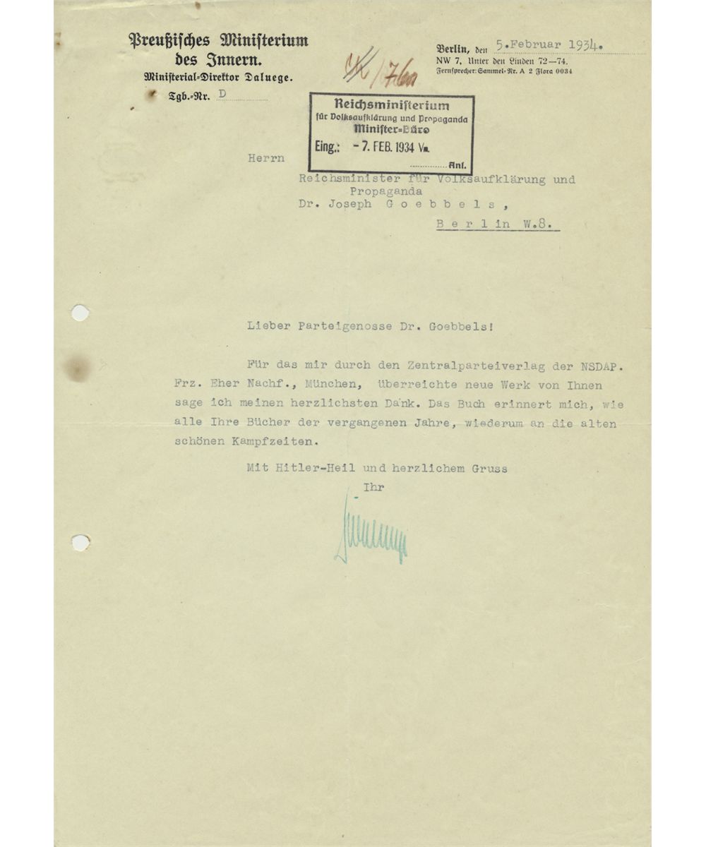 (1897 - 1946) Chief of Security Police in SD central office, appointed SS-Oberstgruppenfuehrer (1942), succeeded Heydrich as Deputy Protector of Bohemia and Moravia. Hanged by the Czechs in 1946. Fine association T.L.S. in green indelible pencil on his Prussian Ministry of the Interior letterhead, 1p. large 4to., Berlin, Feb. 5, 1934 to Minister of Propaganda JOSEPH GOEBBELS. Daluege sends thanks for the gift of a work of historical propaganda, in part: "...For your new work sent to me from the party press of the NSDAP, Franz Eher Nachf., Munich, I express my heartfelt thanks. The book reminds me how all of your books in recent years, of the old [party] battle times...". File holes at left, one toned spot, else very good.