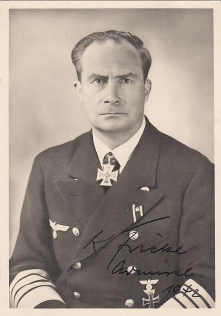 (1889 - 1945) Kriegsmarine admiral and a recipient of the Knight's Cross. Named commander of the Marinegruppenkommandos Süd, killed in the battle of Berlin. Rare war-date S.P. 4" x 5 3/4" b/w, a fine chest, up pose in uniform signed adding rank and date, 1942. Fine.