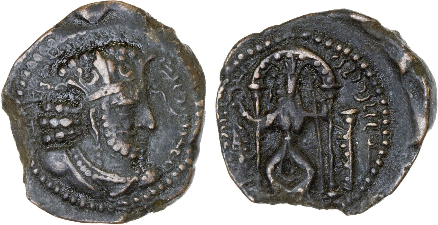 KUSHANO-SASANIAN: Ardashir type, ca. 230-271, AE unit, Mitch-1264/65, bearded bust right // diety within canopy, lovely detailed reverse, VF.
