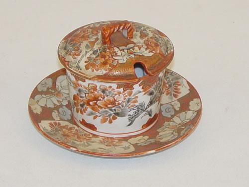 KUTANI 2 PART CONDIMENT DISH W/ ATTACHED UNDERTRAY- SIGNED ON BASE (2 1/2" T X 4 1/2" DIA. BASE) - SEVERAL SMALL HAIRLINES ON BASE, WEAR