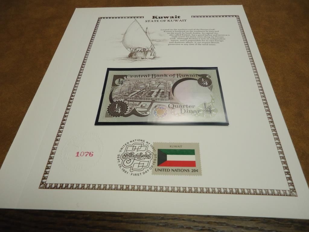 KUWAIT 1/4 DINAR CRISP UNC CURRENCY & STAMP SET