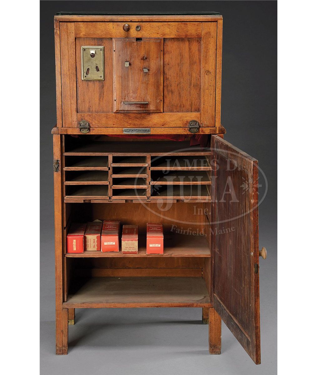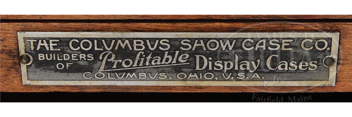 Floor standing display combines a wood cabinet base with rear storage compartment and a slant front glass display case etched "Kwik-lite The Quality Flashlight". Included are eight N.O.S. flashlights and their original boxes. Manufacturer's metal tag reads, "The Columbus Showcase Co., Columbus, Ohio", circa 1918. SIZE: 21" w x 42" t x 12" d. CONDITION: Very good condition; the Kwik-lite graphic on the cabinet front is hand drawn. 1-13215