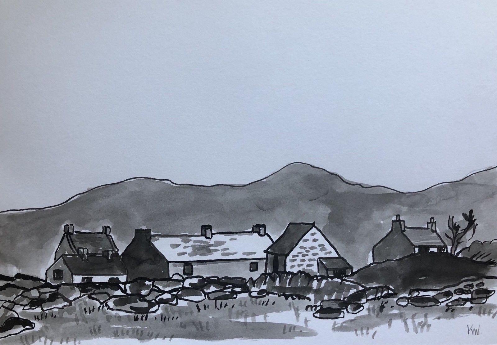 A drawing with water colours of the cottages in the Welsh homeland where he lived. Signed in his initials. His works typically drew inspiration from the Welsh landscape and farmlands. Size: 11x7 inches. Professionally mounted and framed, and supplied with coa.