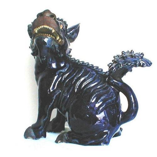 This adorable benevolent imp is about 11 1/2" tall,to the top of his horn, and his body is about 5". Wonderful rich cobalt blue glaze on Shiwan (Shekwan) stoneware body. Please note the incredible details such as teeth, body detail and spikey tail. he is signed on one foot or paw...