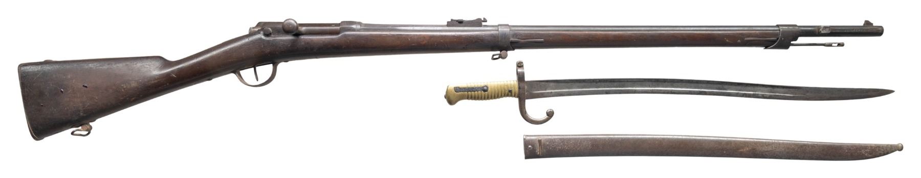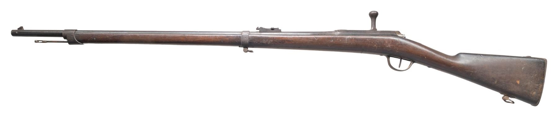 Cal. 11mm Mauser. S# U43420. Bbl. 32 1/2". Blade front sight. Ladder rear sight graduated to 1000m. Matching numbers on bbl. & bayonet lug. Other parts mismatched or unnumbered. French Chassepot rifle later converted by Kynoch in England to 11mm Mauser. Left side of receiver has Kynoch markings. Bbl. has Kynoch markings with varied British proofs & old French serial number. Hardwood stock with bottom mounted sling swivels. Ramrod present. UNATTACHED ACCESSORIES: French M1866 bayonet with matching scabbard. CONDITION: stock has older added finish with some chipping in ramrod channel, a few small spots of what appears to be old glue on right side, scattered finish wear, dings & handling marks. Metal is an overall dull gray patina with overall oxidation. Action is functional when hand cycled. Good bright bore with some light pitting. (01-27843/MJC). ANTIQUE. $500-800.