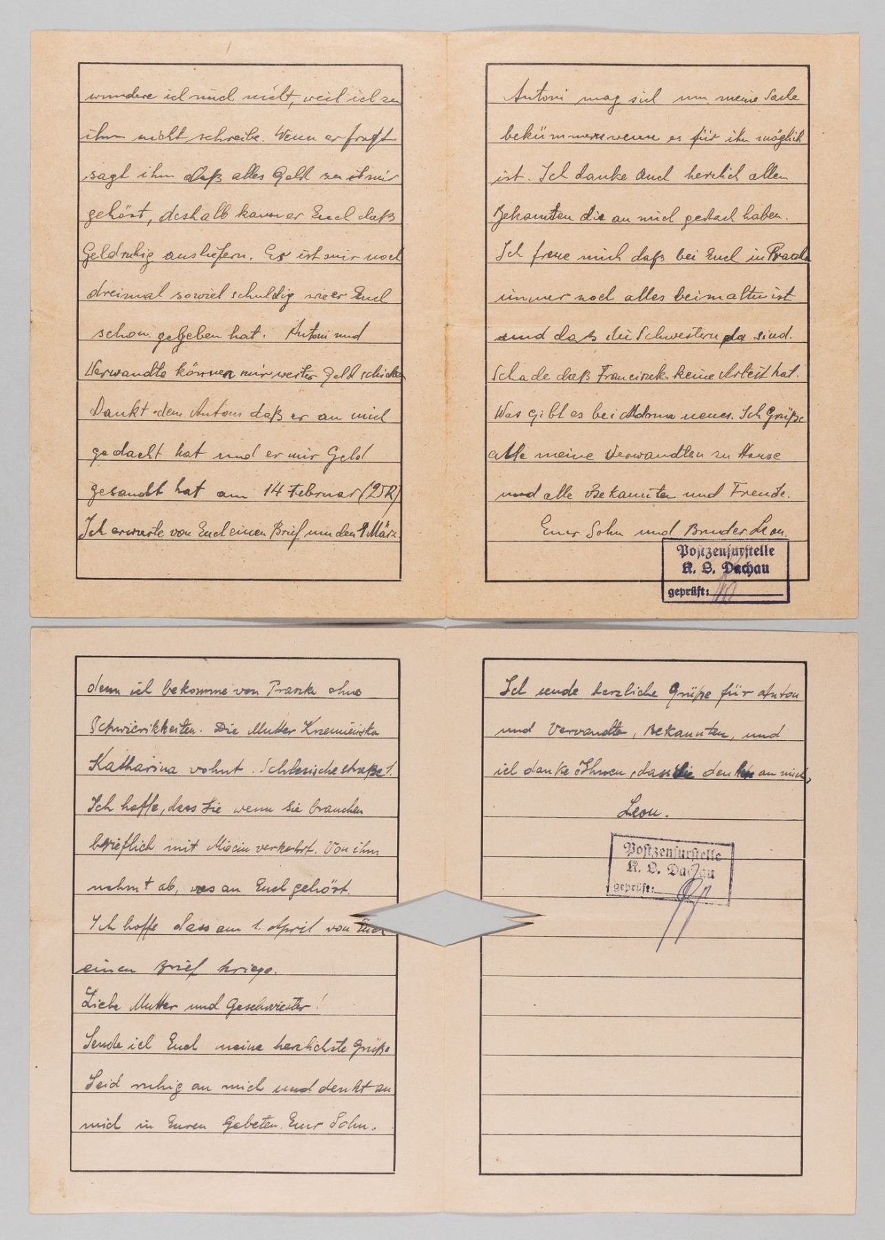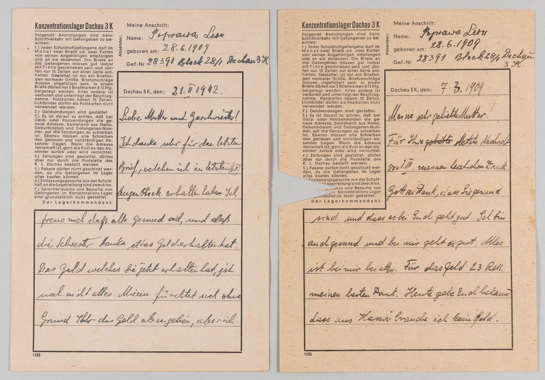 Two letters from the Dachau concentration camp written by Leon Poprawa, born 28.6.1909, prisoner number 28391, Block 28/1, Dachau 3K. Three page letter, dated 21. II 1942, written to his Mother and siblings: 'Dearest mother, brothers and sisters! Thank you for the last letter. I'm happy you are all healthy and that sister received some money...it is not all the money...he is worried about giving away the money, but I'm not surprised since I'm not writing him. He owes me three times as much as he has given you. Anton and family can continue to send me money, thank him that he has thought of me and sent me money. I look forward to your letter. Anton can take care of my business if he is able to. I thank all friends that have thought of me. I'm happy everything is going well with you, Greetings to all relatives and friends at home. Your son and brother Leon.' KL Dachau censorship stamp on page three, 8.25 x 5.75 inches. The second letter has been cut (censored?) at the left edge, dated 7.3. with a wrong year, he confuses his birthyear with the present year. Leon writes his to his mother: 'My dearest mother! thank you for the last news, thank god you are healthy and that you are doing well. Thank you for the 23 Reichsmark. Think of my in your prayers. I send my greetings to Anton and the relatives , friends and family. Leon.' censorship stamp at conclusion. Two pieces.