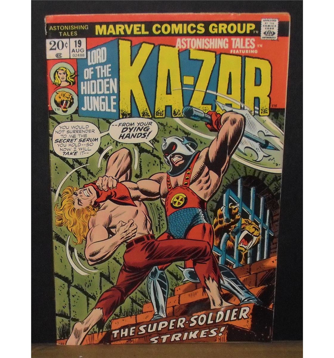 Indeed very old, interesting with great action drawings in colour and rare is this vol. 1 #19, 1973 Marvel Comics "Lord of the Hidden Jungle Ka-Zar" as 'The Super-Soldier Strikes!', 20 cents then now very collectible wonderful comic book Printed in the U.S.A., as is in near mint or mint (everything, yes COVER and all pages seem MINT since NOT read yet); for your collection or start one now, or exchange with a collector or give to a friend !