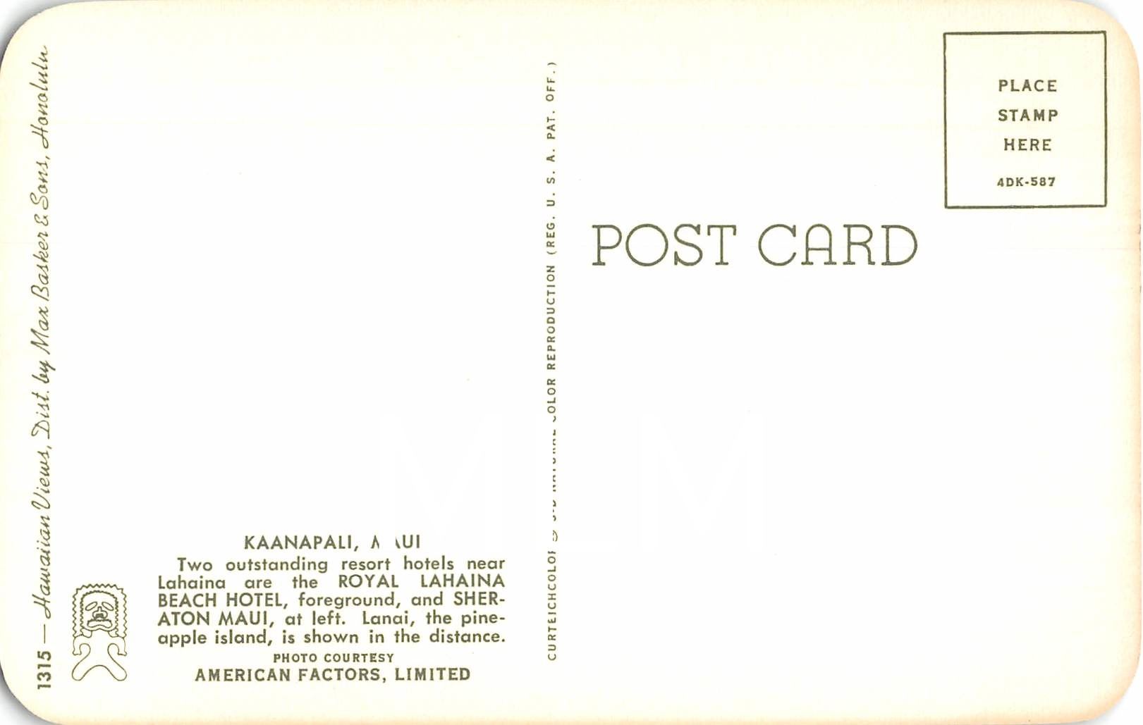 Kaanapali, Maui & Showing Lanai in Distance Postcard