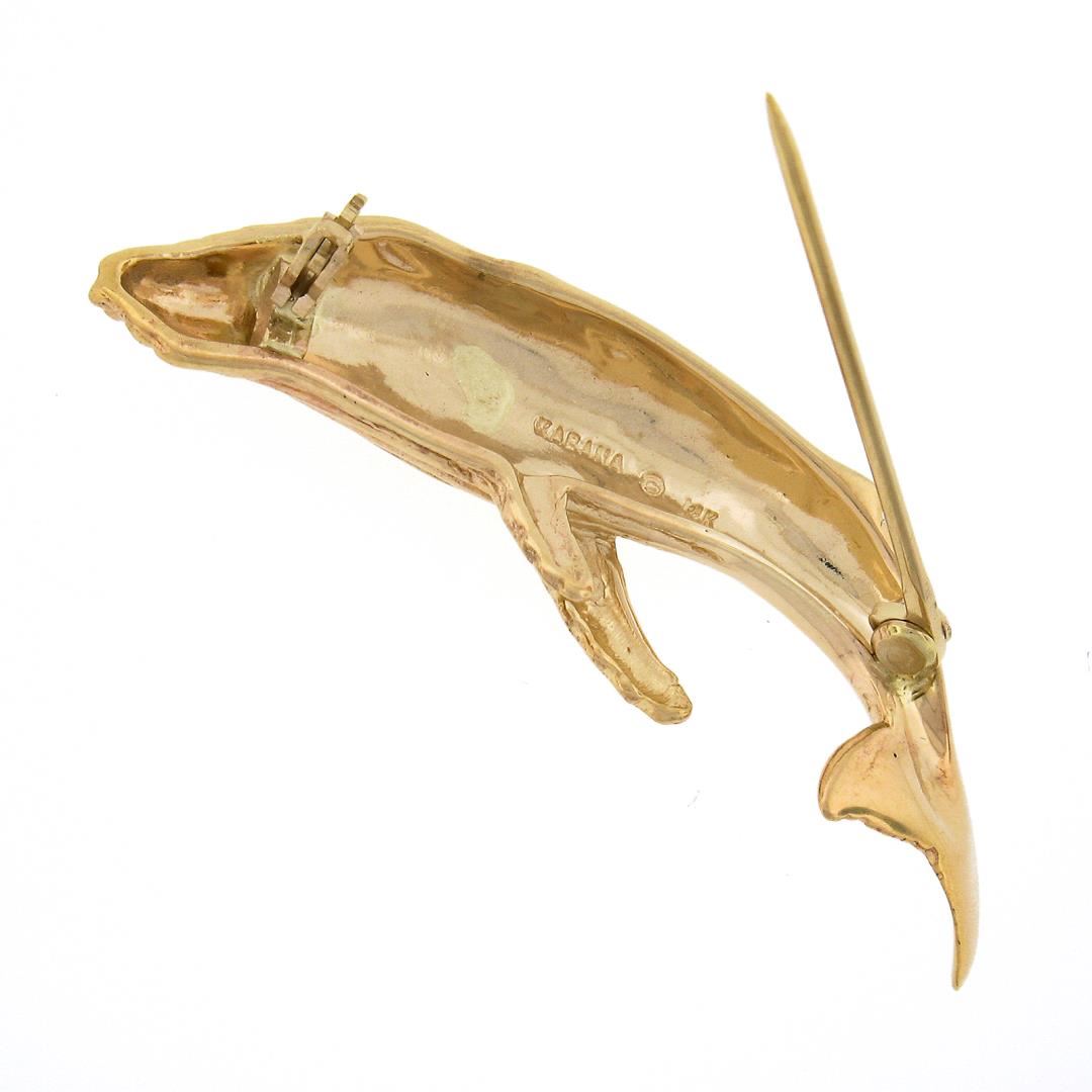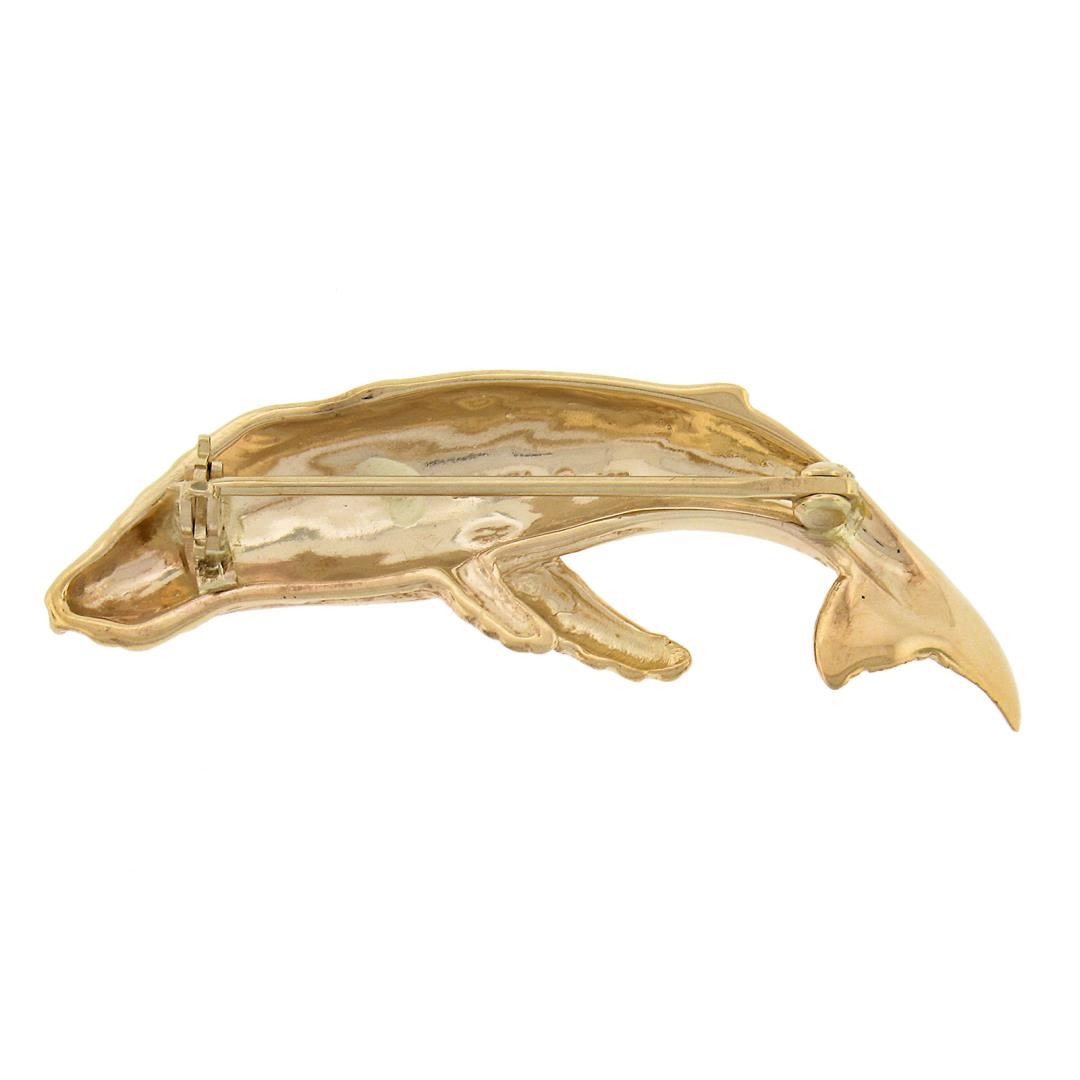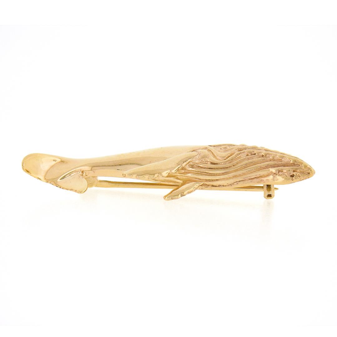 a solid 14k yellow gold whale brooch by Kabana. Measures 13.60x40.90mm and weighs a total of 5.15 grams.