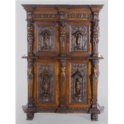 német, 19. sz. közepe, faragott, tömör diófa, felül 1 fiókkal, felso ajtaja mögött 7 fiókkal, a fiókhomlokzat festett jávorfa, és 1 zárható rekesszel, 2 fiók hiányzik, 155*114*54 cm, 2 fiók hiányzik