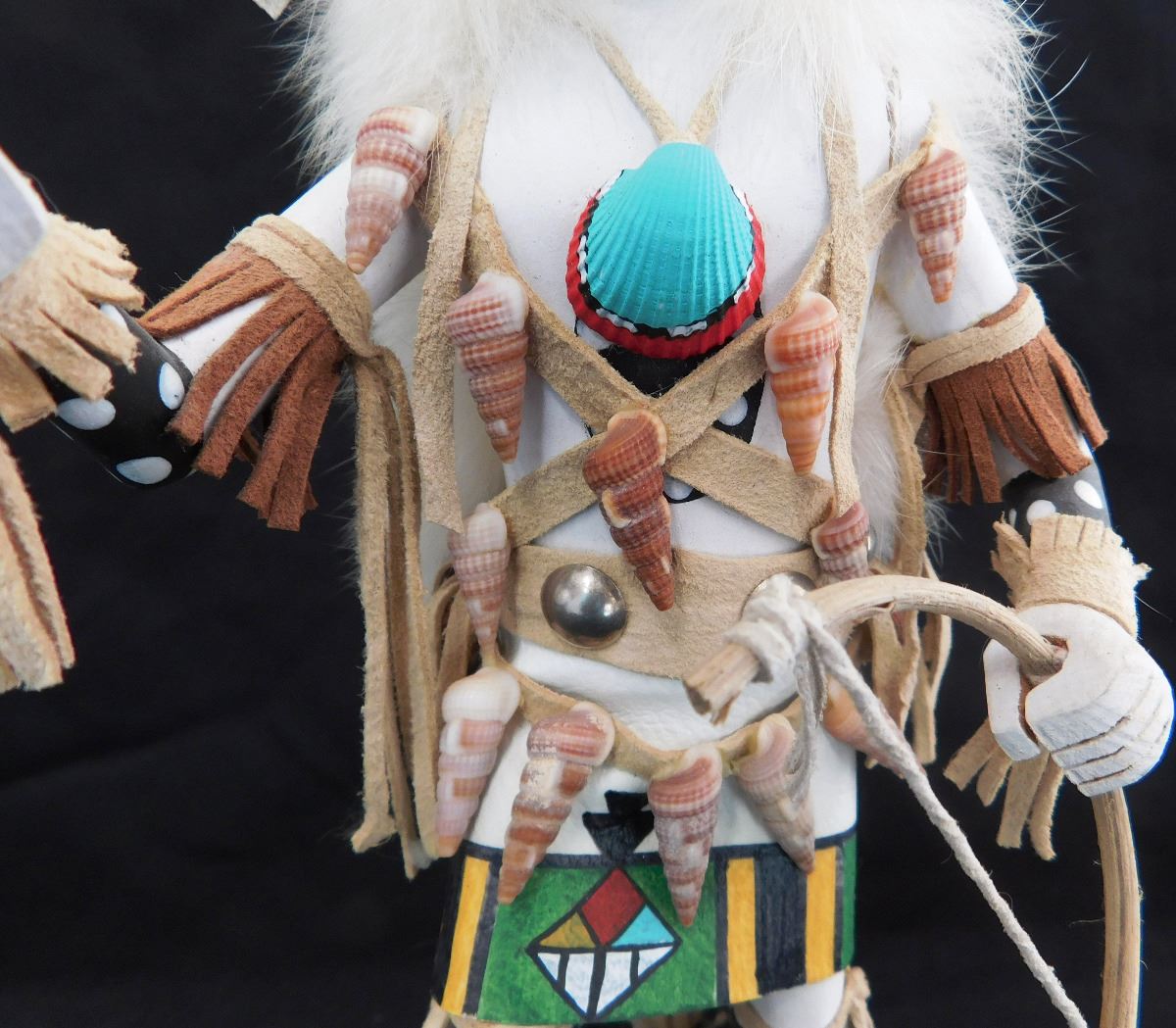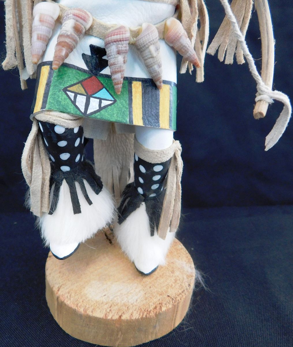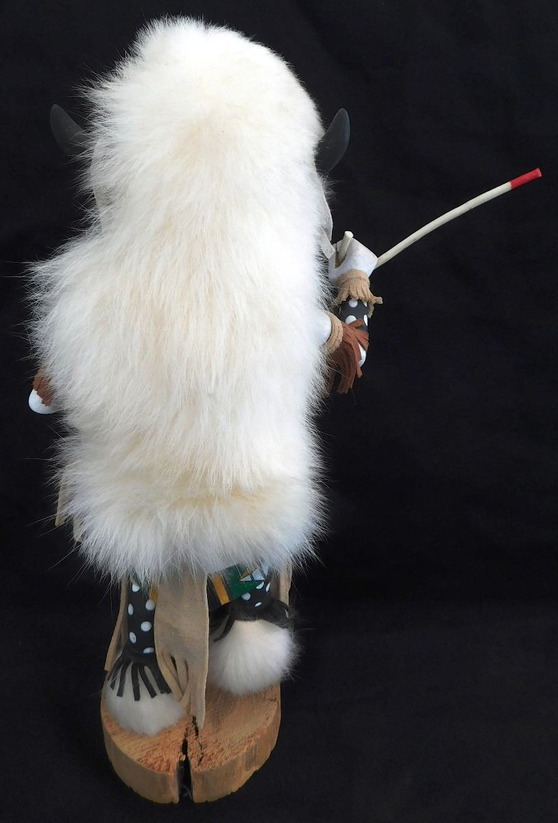 Kachina "Buffalo Dancer," from about the 1970's. This very nice kachina measures 11.5 x 7 x 5.5 inches. Kachina is made from cottonwood, leather, shell, fur and conchos with great painting. Condition: Very nice, see images. Shipping: $22.50