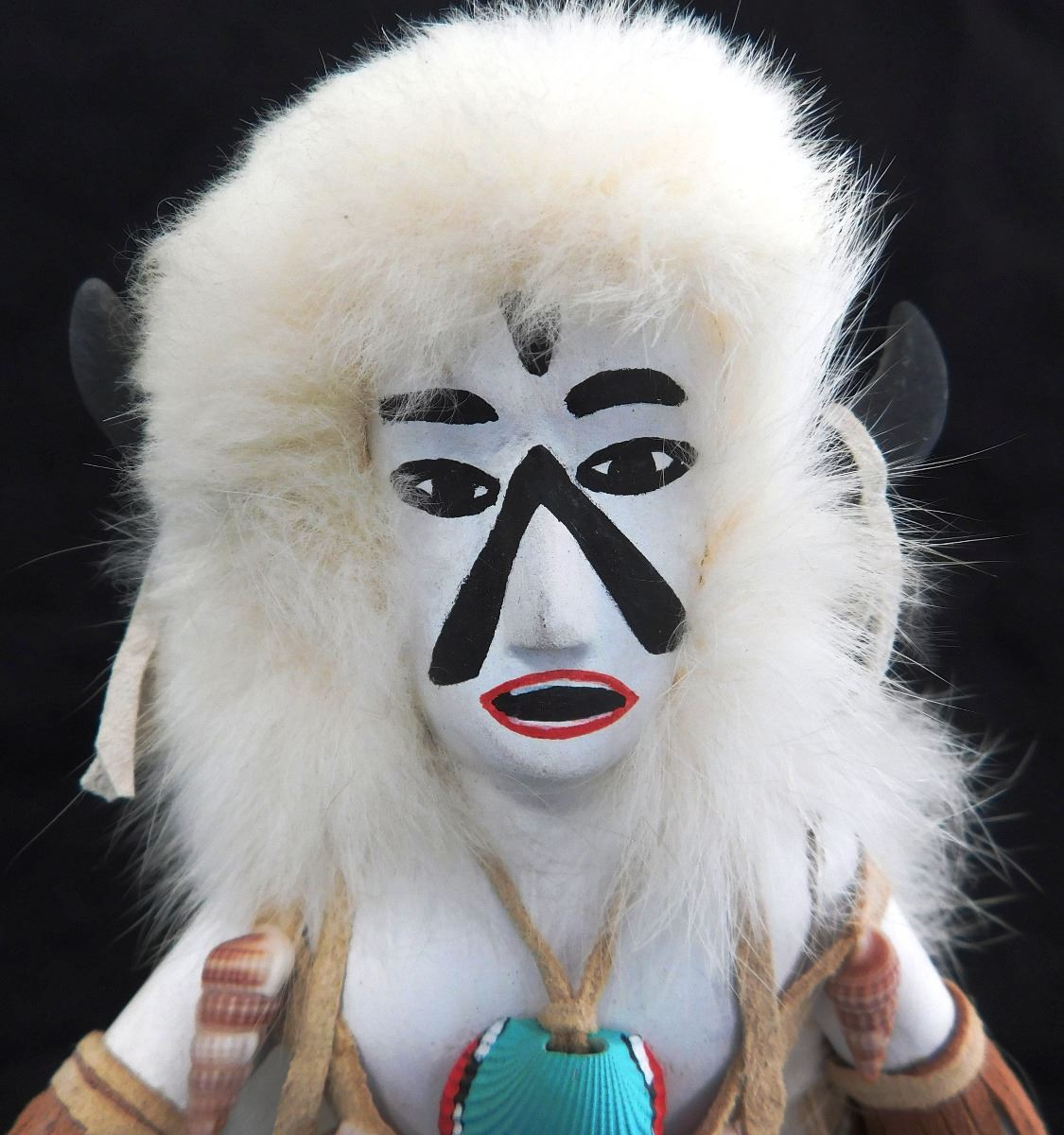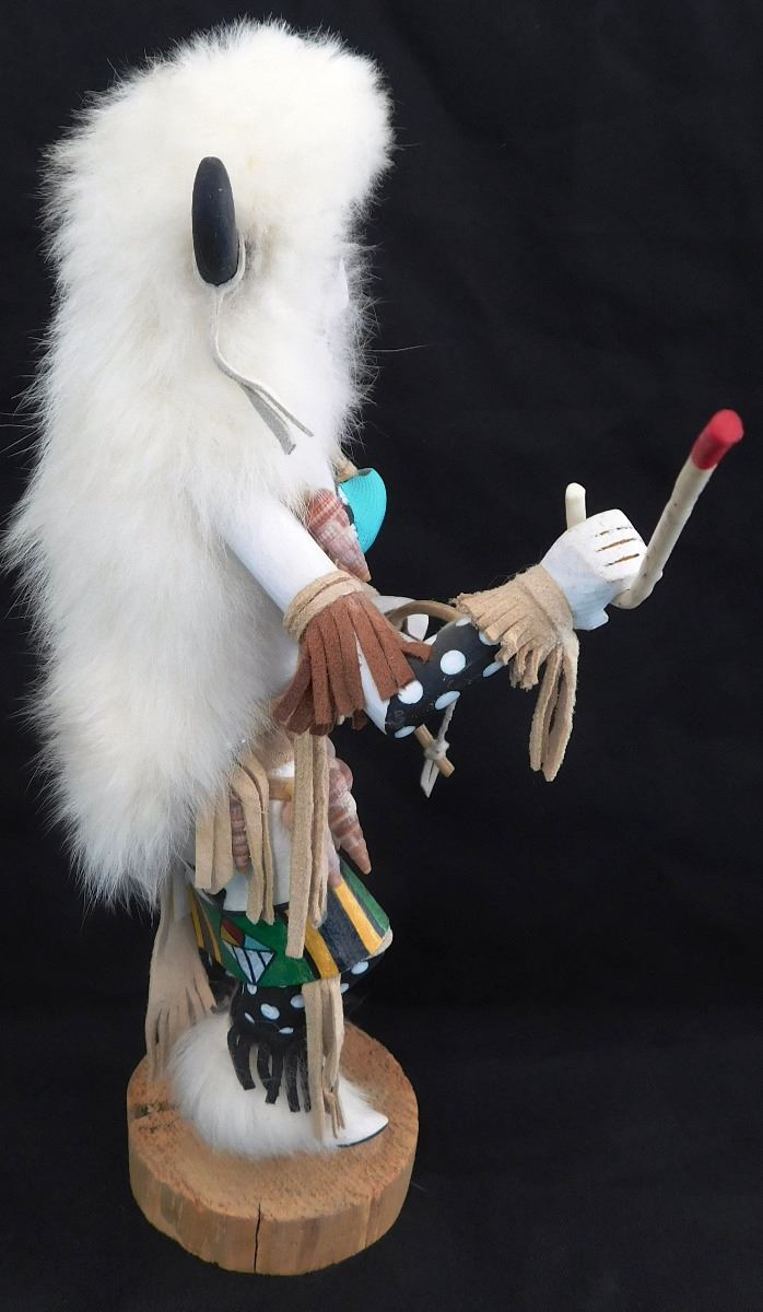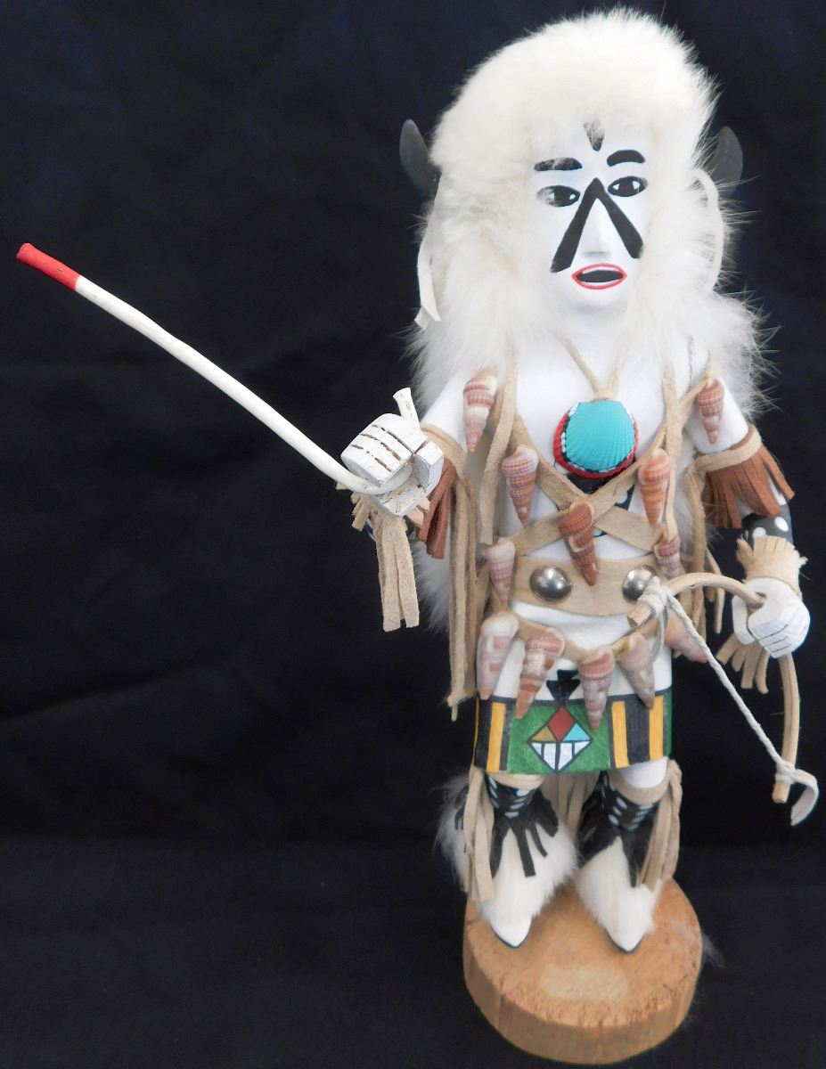 Kachina "Buffalo Dancer," from about the 1970's. This very nice kachina measures 11.5 x 7 x 5.5 inches. Kachina is made from cottonwood, leather, shell, fur and conchos with great painting. Condition: Very nice, see images. Shipping: $22.50