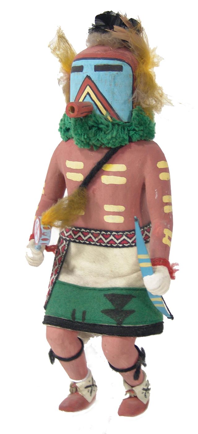 Mid 1900s, Hand carved and painted Hopi cottonwood root kachina dancer with a rattle and bow. 11"