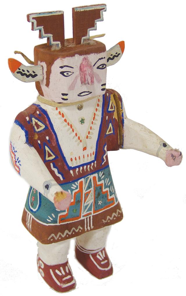 Mid 9100s, Hand carved and painted Hopi cottonwood Route 66 kachina with great paint and sequin decoration. 10-3/4"