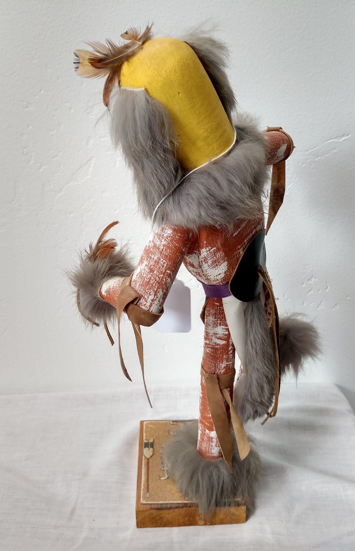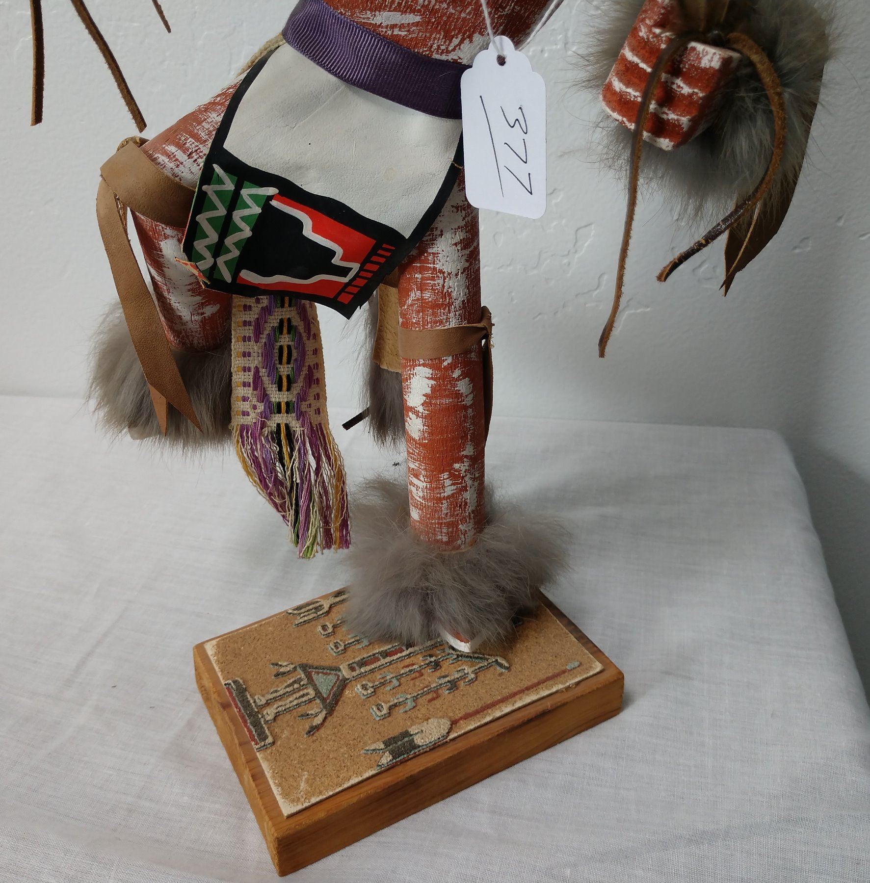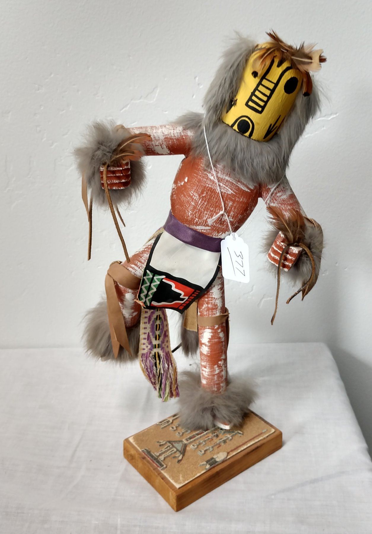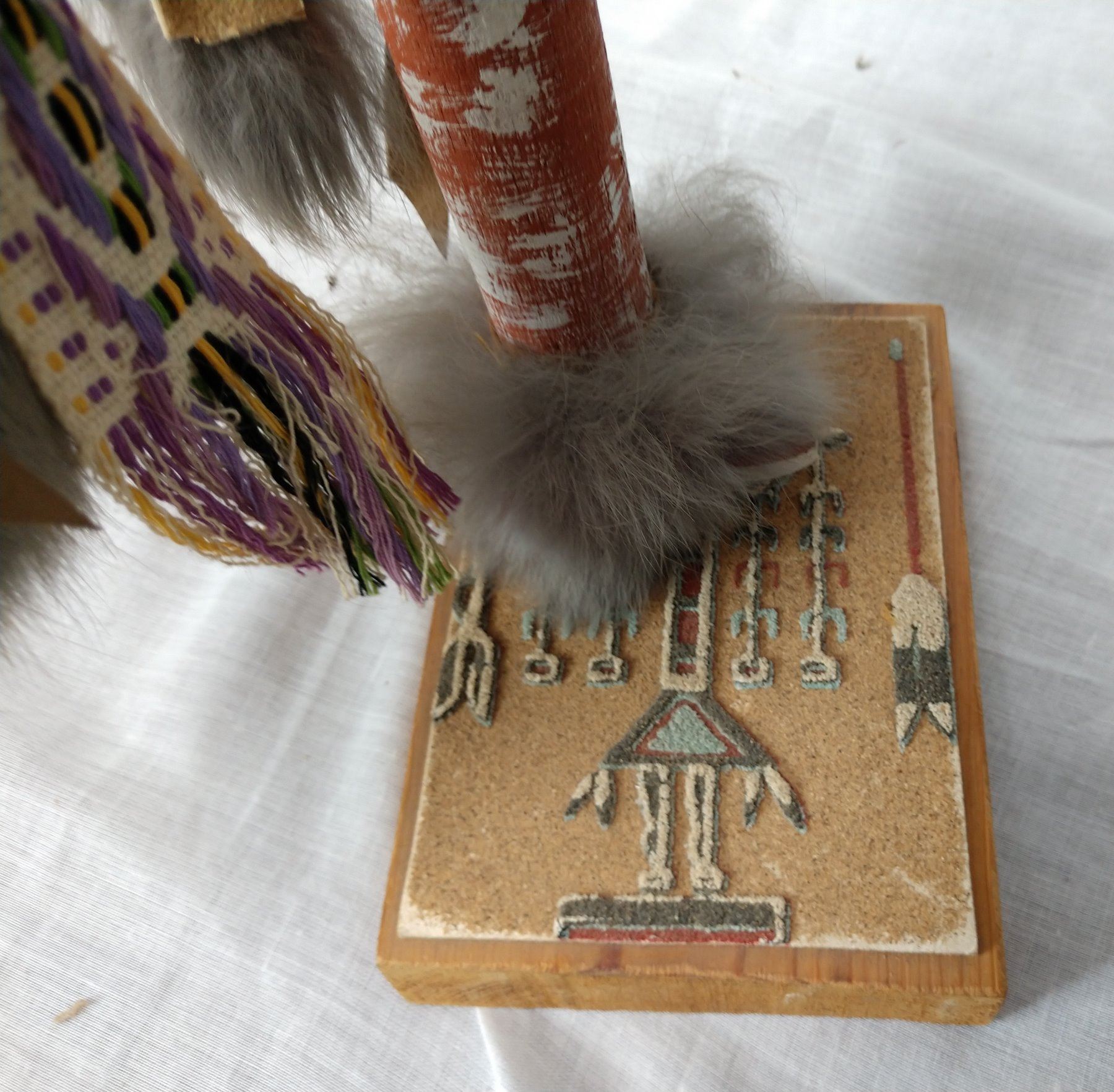Kachina Doll, c. 1970s. Made of wood, fur, feathers and paint, the item measures 14" x 7". Hopi-Tewa, Arizona. Signed on bottom, sand painting on base. Condition: Good, see images. Shipping: $30.00 w/insurance and signature, due to size.