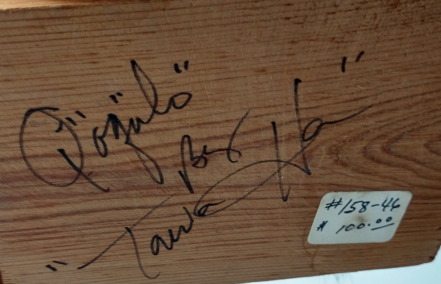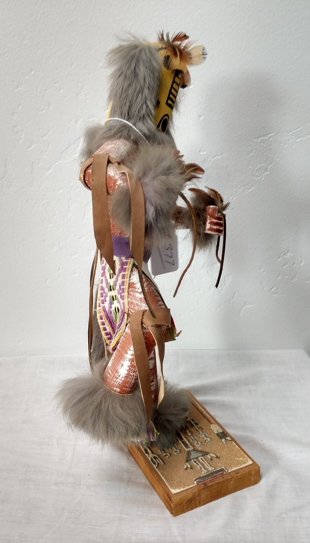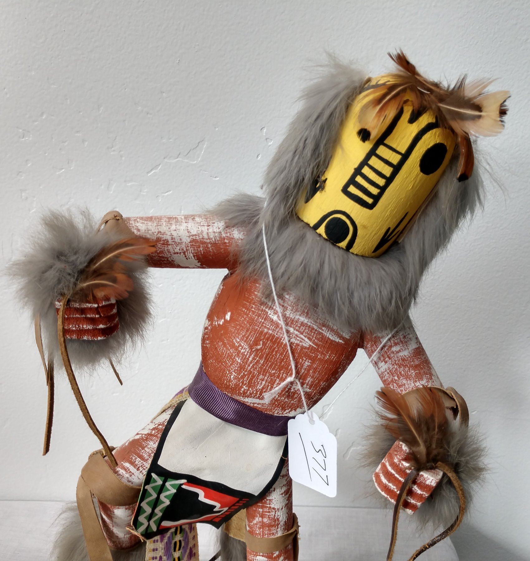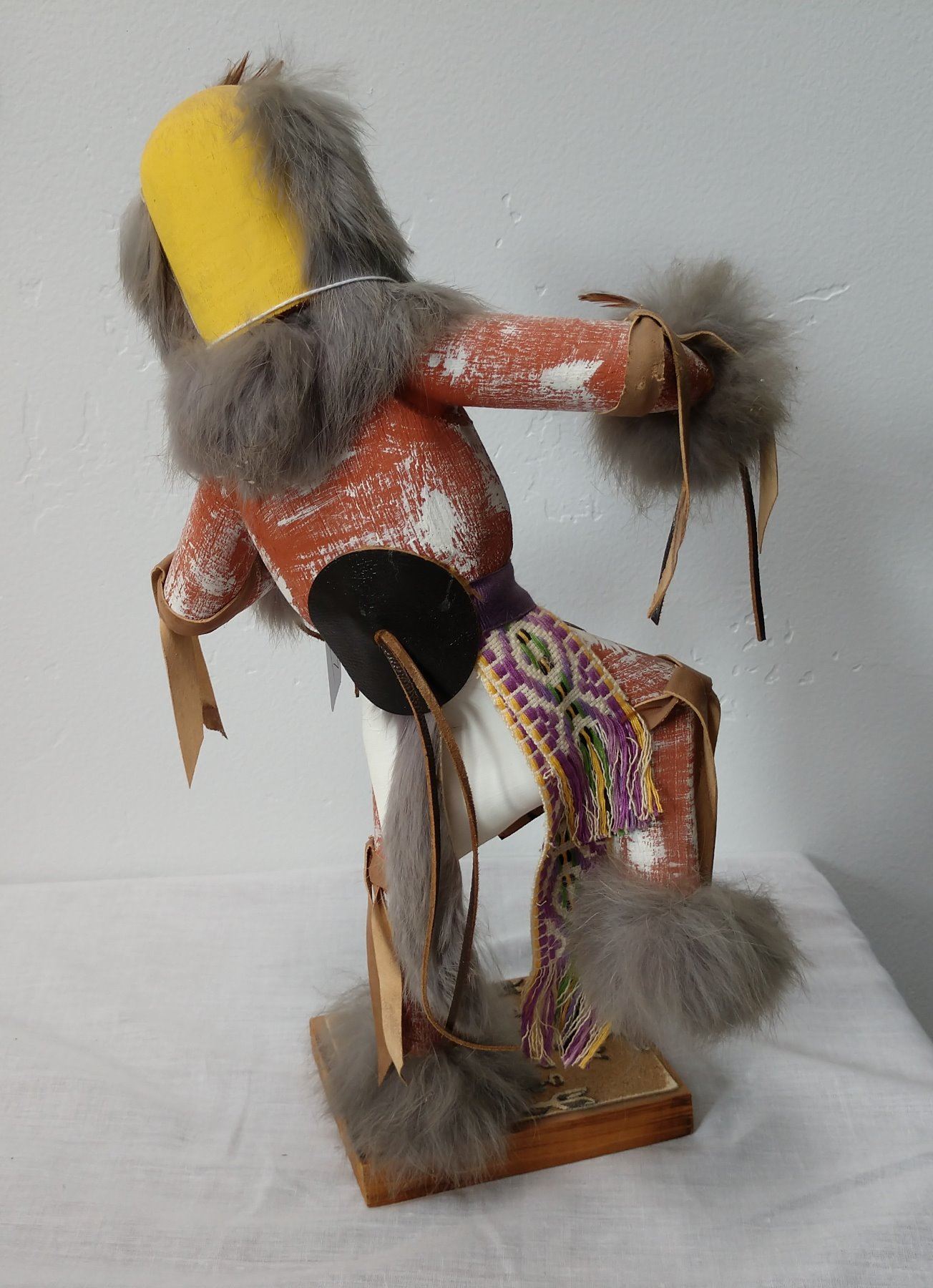 Kachina Doll, c. 1970s. Made of wood, fur, feathers and paint, the item measures 14" x 7". Hopi-Tewa, Arizona. Signed on bottom, sand painting on base. Condition: Good, see images. Shipping: $30.00 w/insurance and signature, due to size.