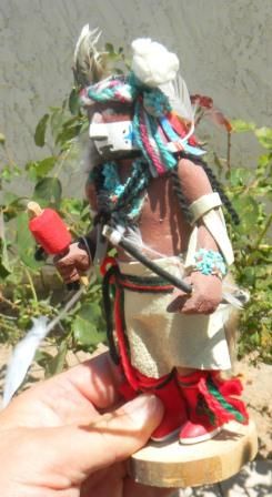 Painted cottonwood Hopi Kachina doll Zuni The bottom is signed by Alvert Lamy 1999 and indicates Zuni Apache Dancer. Dancer is seven inches doll and has leather, fur and clothe clothing with turquoise and feathers. Quite nice. Holding bow and arrow and rattle. Shipping $15.00 Great condition