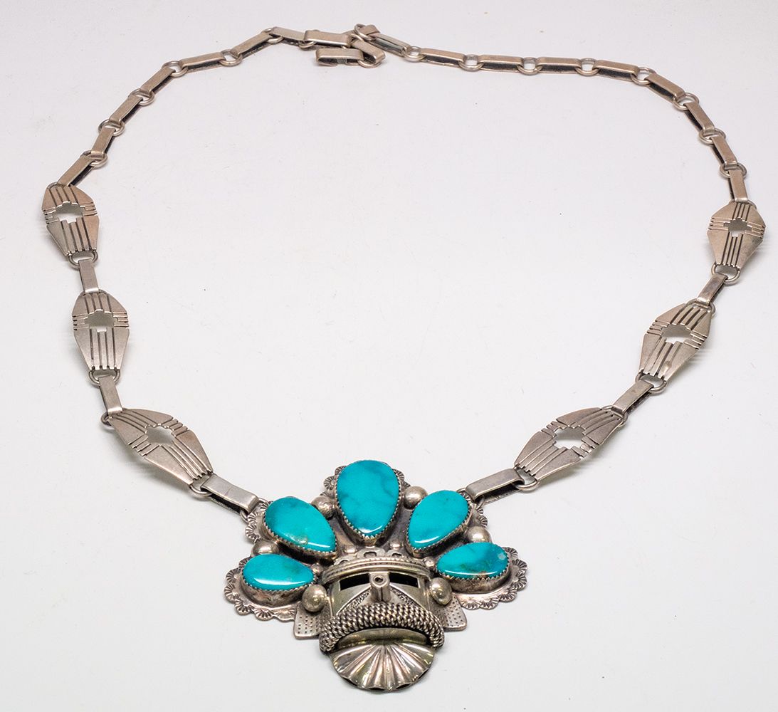 A finely made silver and turquoise necklace with hand-made silver decorative link chain and a central pendant in the form of a kachina mask. The headdress consists of 5 oval turquoise cabochons edged in scalloped silver. The pendant measures 3” tall and 3” across and necklace is 15” long. Very detailed. Makers name stamped on the reverse: T.C. Oshlish. Sterling silver. - HKA#65181