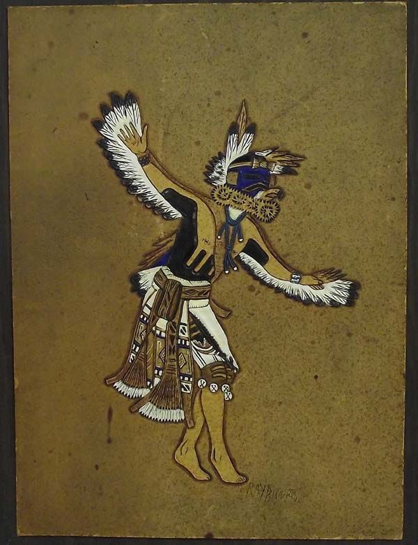 Kachina Sculpted & Painted On Leather - Ray Briggs. Measures approx. 15 3/4''H X 11 3/4''W. Mounted on wood with hanger on the top, some staining on the leather.