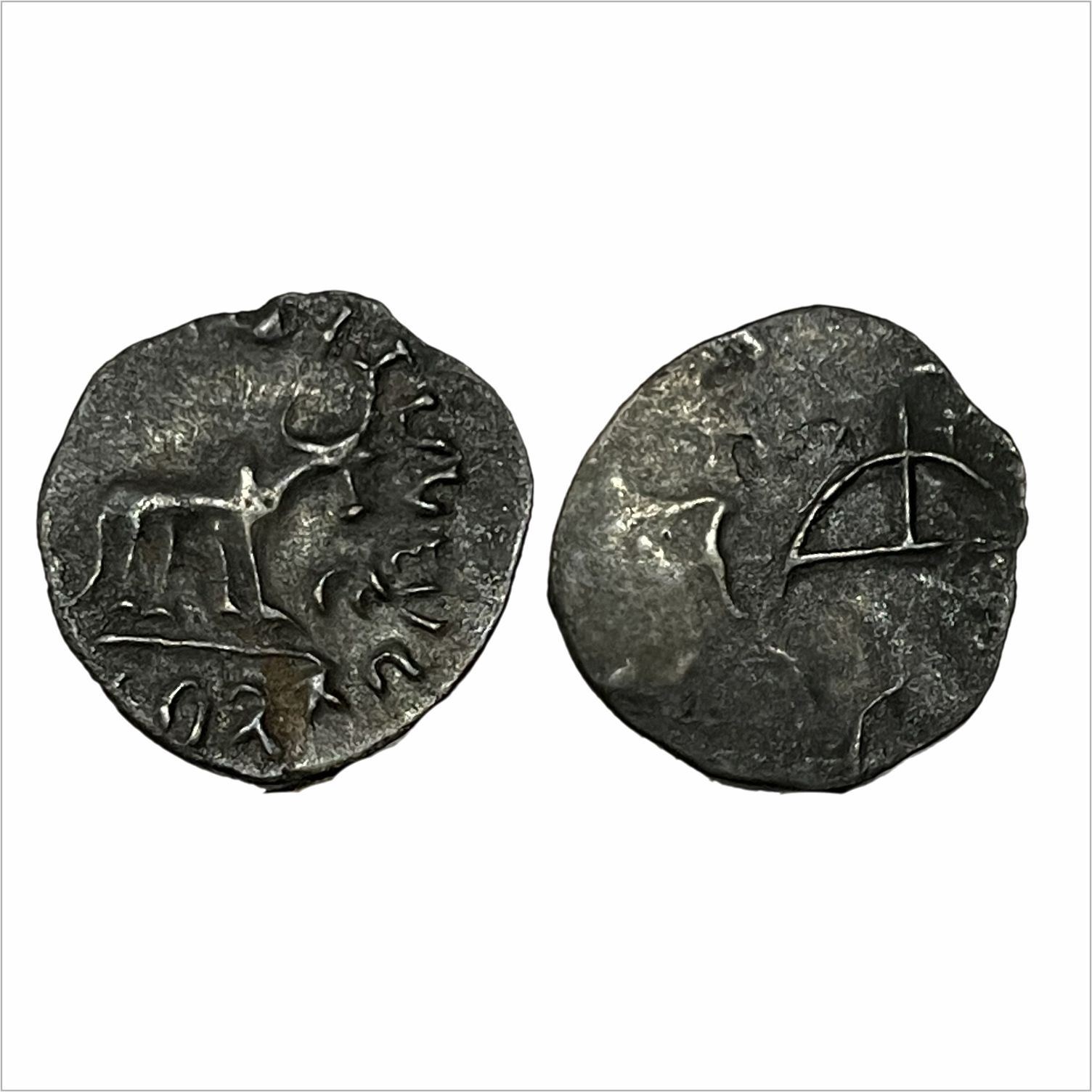 Kadambas of Banavasi, (AD 325-620). Potin Unit, 1.06g, Obv: Bull facing to right, Crude illegible brahmi legend around, Rev: Bow & Arrow.