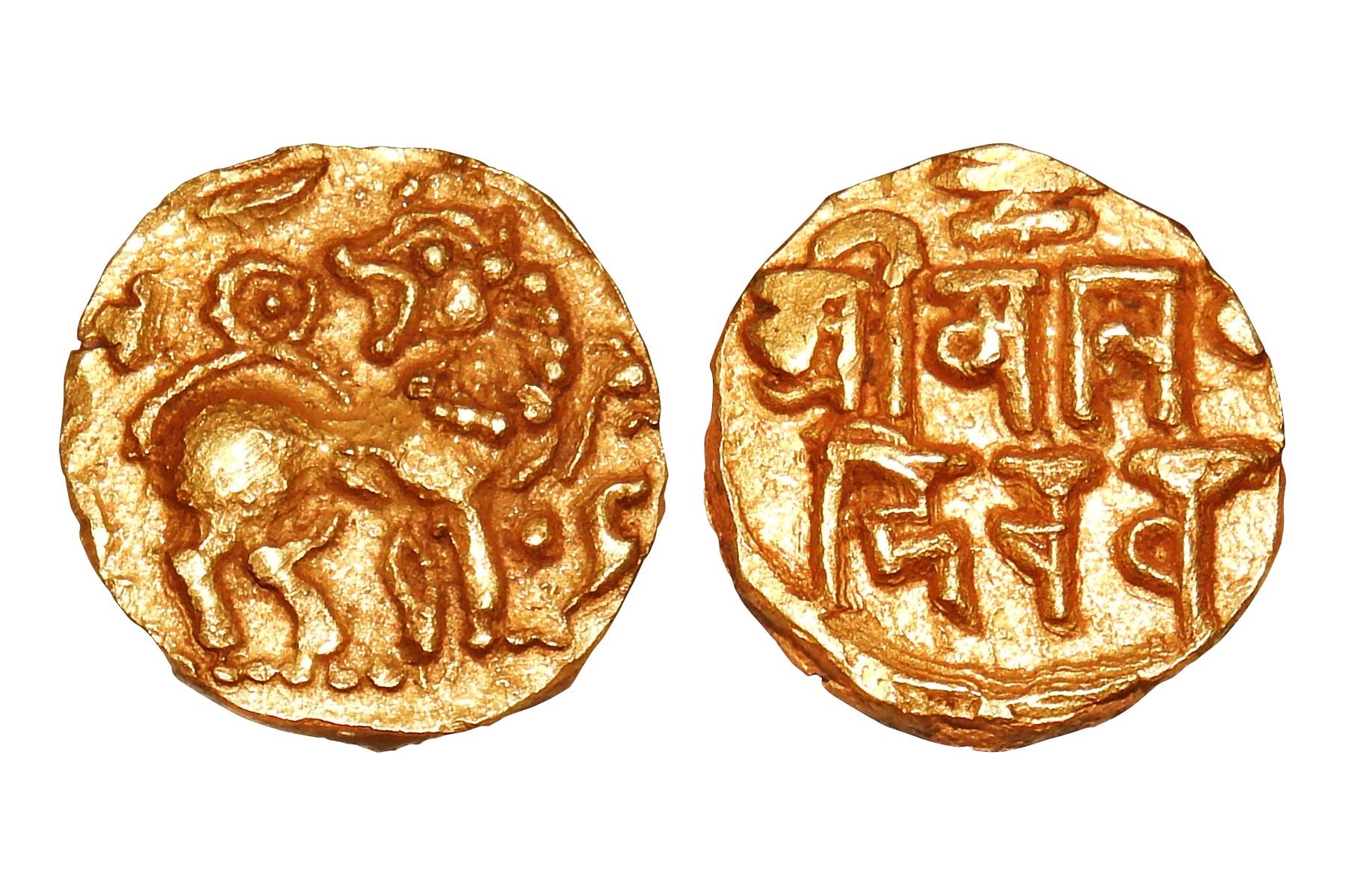 4.21 grams. Obv: lion retrospectant with paw raised. Rev: Nagari legend Shri Malegai Bhairava below a trident symbol (only base visible). The title ‘Malegai Bhairava’ suggests the Kadamba victory over Malenadu or the hilly region of Karnataka located to the East of Goa. This title was first held by Jayakeshi-I and it is seen also on seals accompanying Kadamba copper plate grants. Coins like this are referred to as ‘Bhairava Gadyana’ in Kadamba inscriptions. This coin is of great historic significance, Deep Strike, Well preserved specimen, Exceedingly Rare.