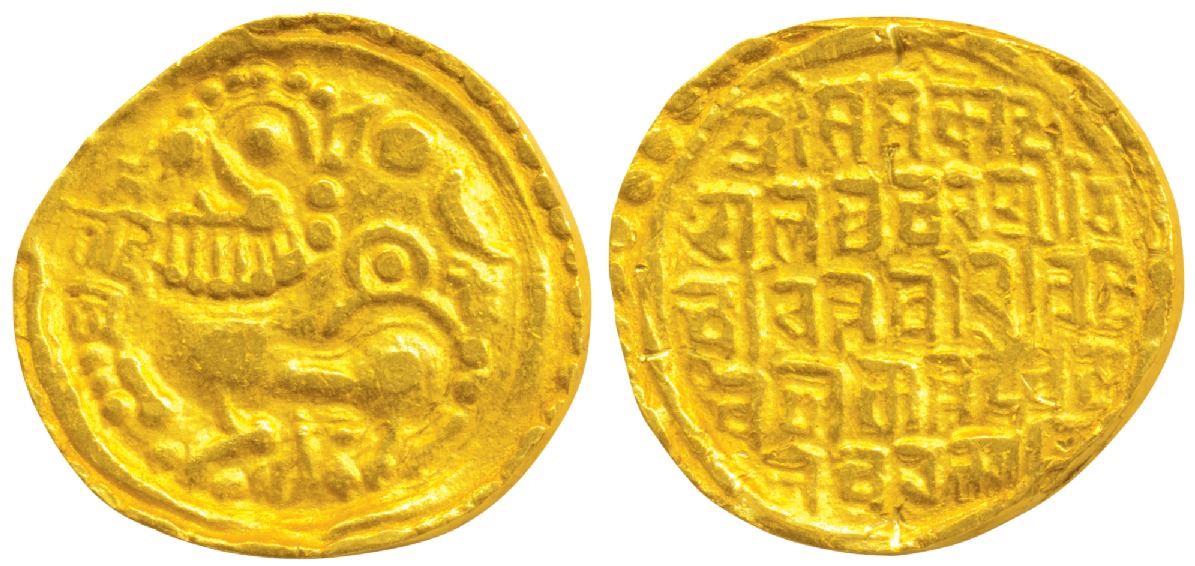Kadambas of Goa, Sivachitta (c. 11th century AD), Gold Pagoda, 4.1g, obv. lion standing to left, rev. Nagari legend Sri Sivachitta Vira Parmmadideva Mala Haramari in five lines (Chattopadhyaya 147-150; Mitch K&A 239; Friedberg 306). Ex-mount, Very Fine+, Rare.