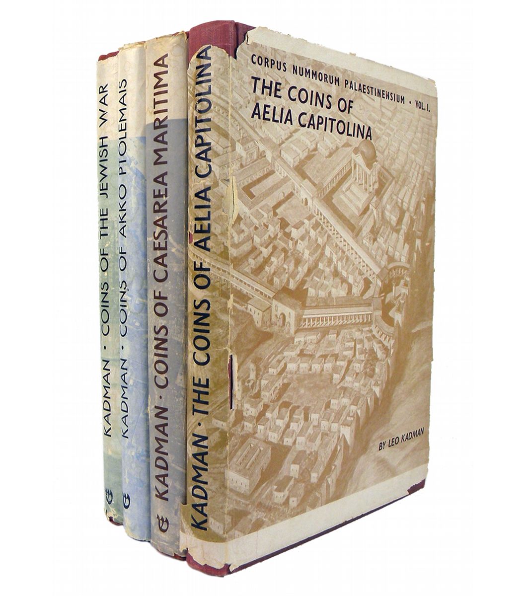 Kadman, Leo. CORPUS NUMMORUM PALAESTINENSIUM. VOLUME I: THE COINS OF AELIA CAPITOLINA. VOLUME II: THE COINS OF CAESAREA MARITIMA. VOLUME III: THE COINS OF THE JEWISH WAR OF 66-73 C.E. VOLUME IV: THE COINS OF AKKO PTOLEMAIS. Jerusalem: Israel Numismatic Society, 1956-61. Four volumes complete. 8vo, original matching brown cloth, gilt; jackets. 191, (1); 243, (1); 203, (1); 240 pages; maps; 17 + 19 + 5 + 19 plates. Jackets worn; very good to near fine copies. Clain-Stefanelli 2986, 2989, 2922 and 2988. Grierson 92. Kroh 61: "essential to the serious collector."
