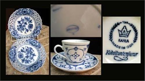 Kahla GDR cup and saucer and a pair of delft style pierced edge decorative plates made in Germany. Plates measure 6" across, no chips or cracks