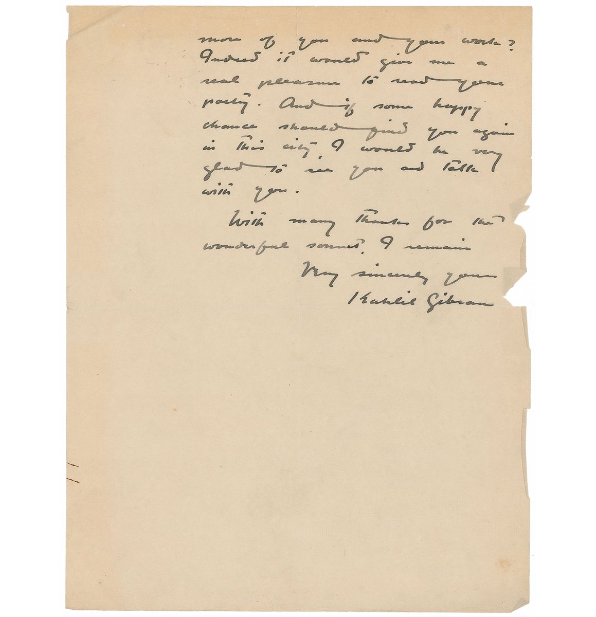 Lebanese-American artist and writer (1883–1931) best known for his writings on religion and for his best-selling 1923 spiritual-philosophical classic The Prophet. ALS signed “Kahlil Gibran,” two pages, 8.5 x 11, October 15, 1915. Letter to poet Orrick Johns. In part: “How more than gracious of you to send me this remarkable sonnet. It delights me exceedingly, and though it reveals a world beyond my reach I cannot but be moved by it. And what is this in life that sustains us, we poor children of hunger and thirst, but that which intensifies our thirst and deepens our hunger? Is it not the unattainable that loves and comforts us?—and how well you have expressed the unattainable in your sonnet. And may I not know more of you and your work? Indeed it would give me a real pleasure to read your poetry. And if some happy chance should find you again in this city, I would be very glad to see you and talk with you…many thanks for that wonderful sonnet.” In very good condition, with central vertical and horizontal folds, a few areas of paper loss and several tears to edges (not substantially affecting any writing), and scattered creases.