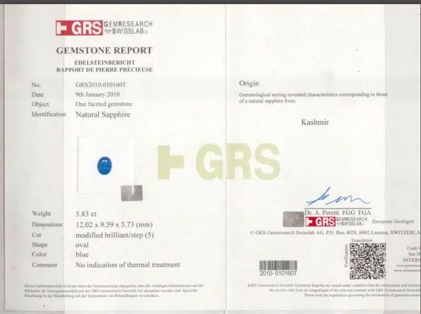 Kahmir Sapphire 5.83 ct -AGL & GRS Certifed....oval cut...completely free of any kind of treatment.