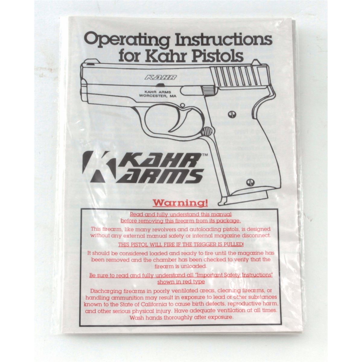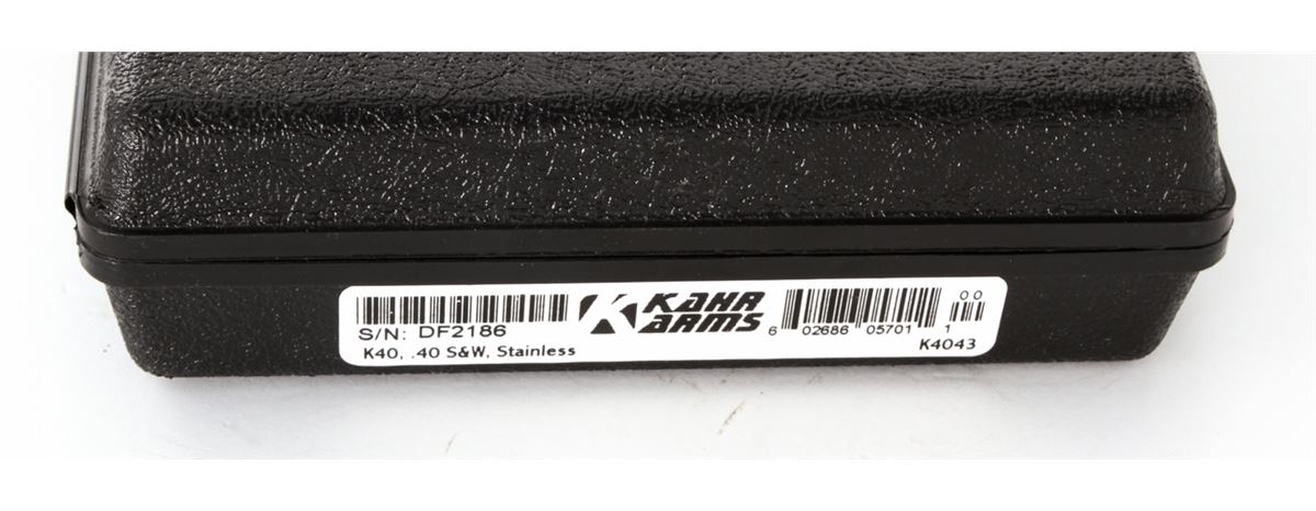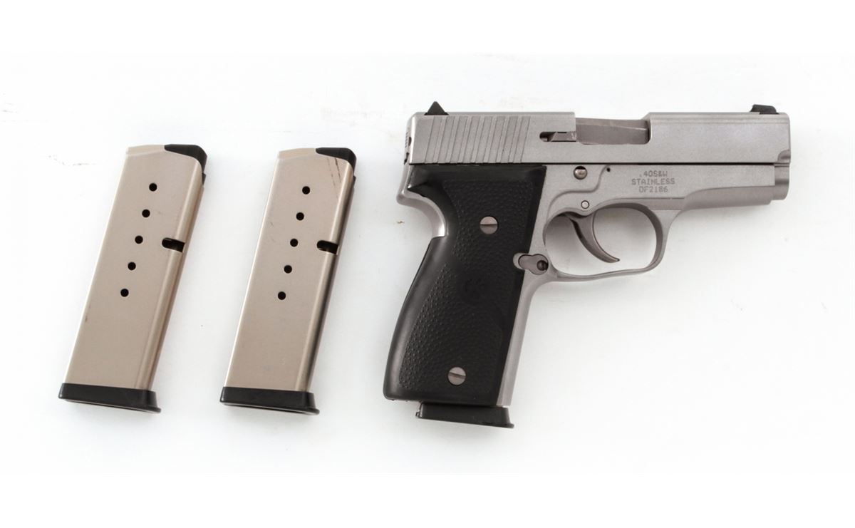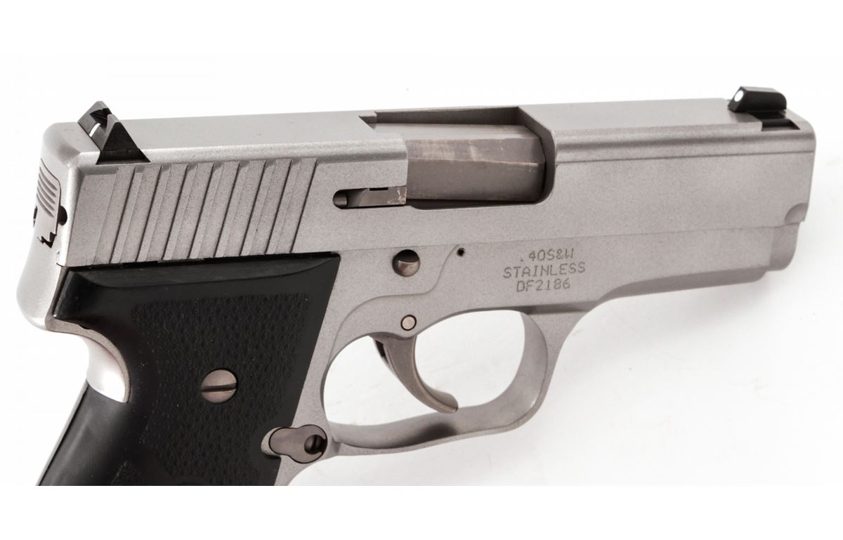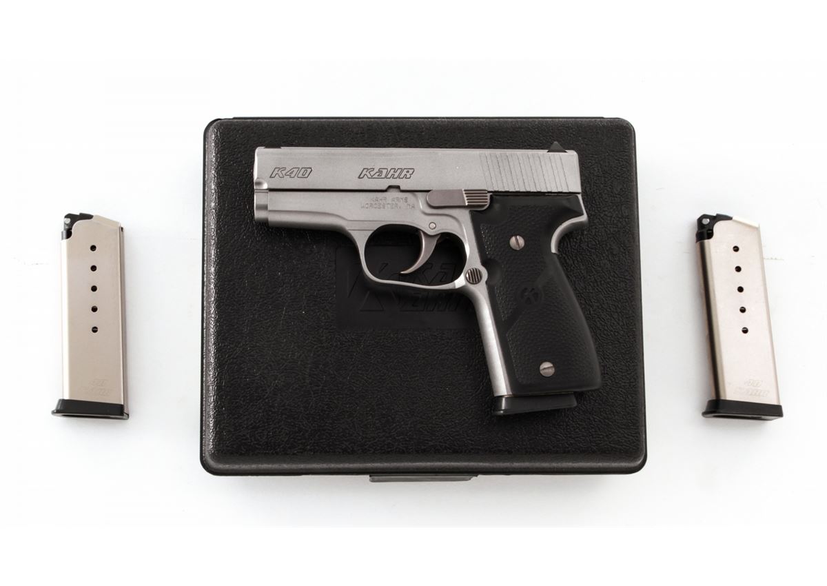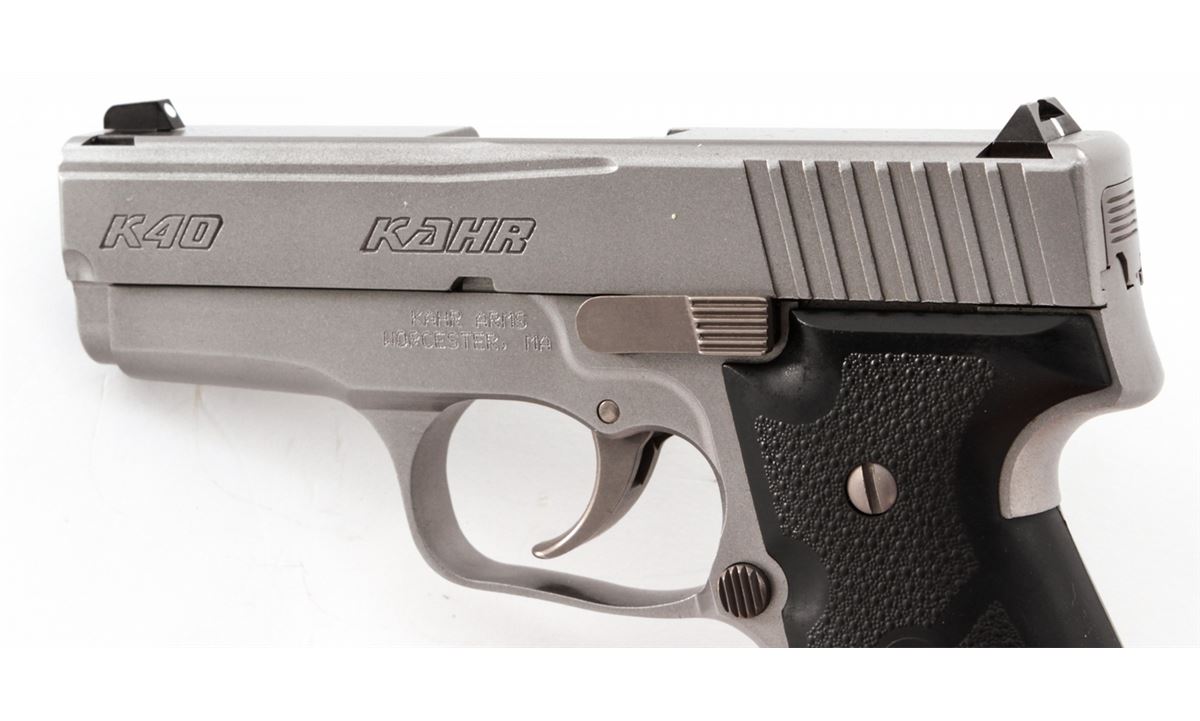 Kahr K40 Semi-Automatic Pistol, #DF2186, .40 S&W cal., 3-1/2'' barrel, stainless steel, factory rubber grips, with three (3) total magazines, in original box with instructions. Condition is excellent showing possible range use. Est.: $350-$500. (Modern)