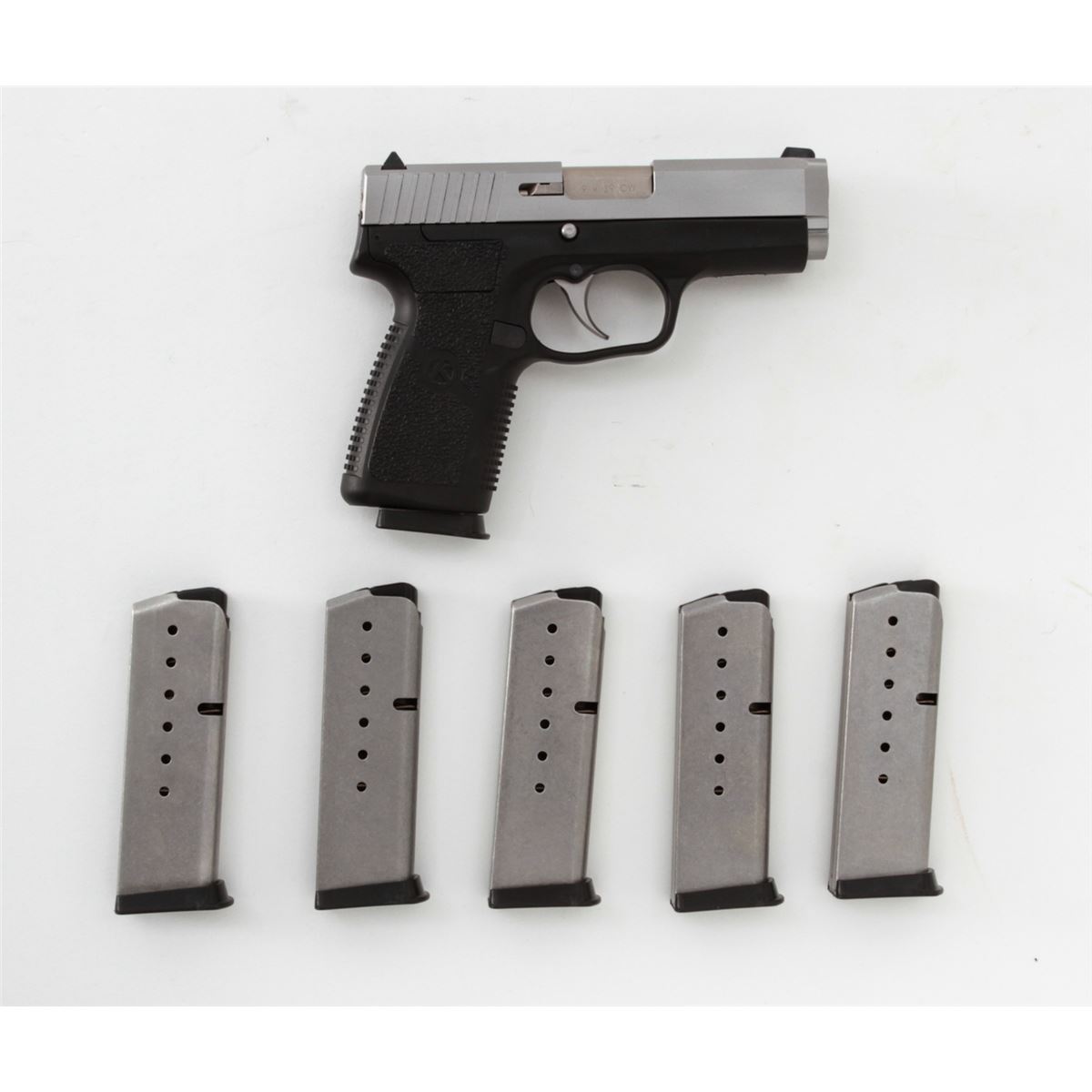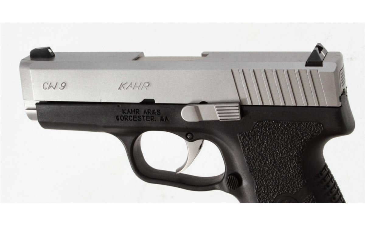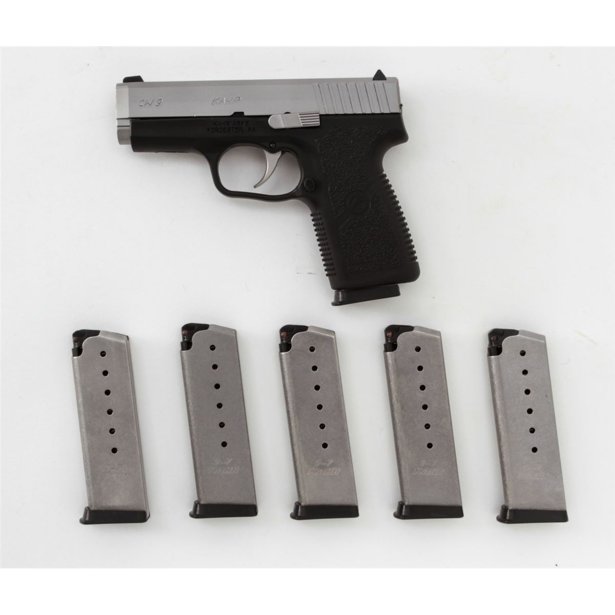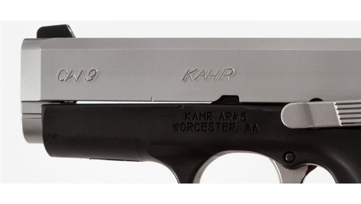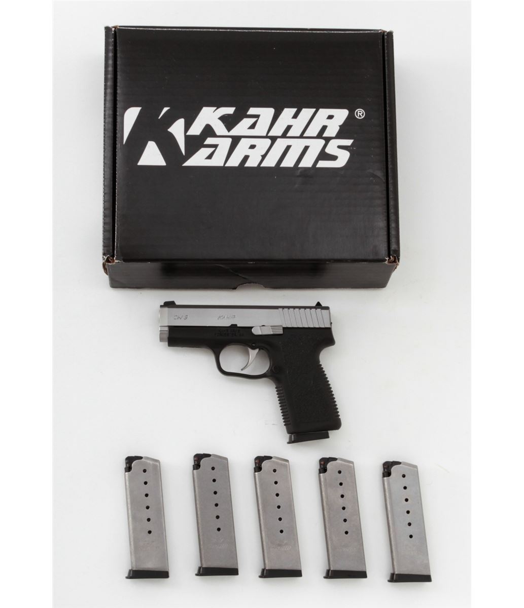 Kahr Model CW9 Semi-Automatic Pistol, #ELO101, 9mm, 3.5'' barrel, stainless and polymer, with six (6) magazines and associated paperwork. One of the top CCW firearms in Orange County. Condition is excellent, appearing as new, in original box showing light range use. Est.: $300-$500. (Modern)
