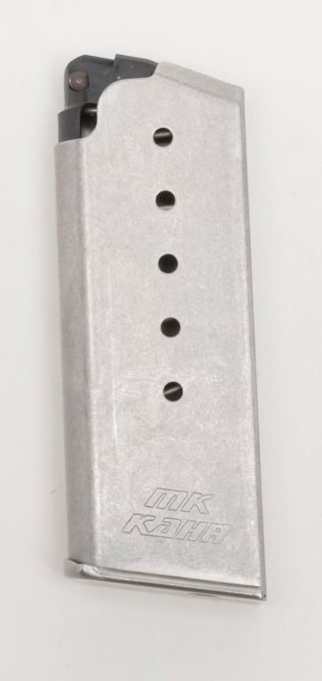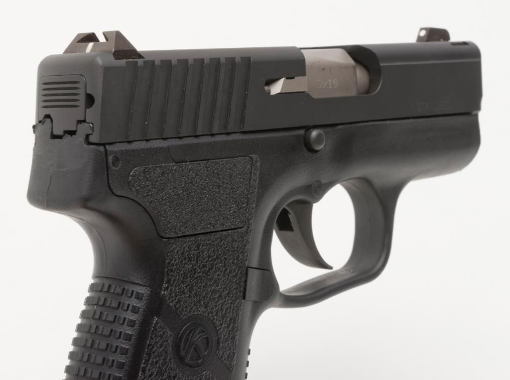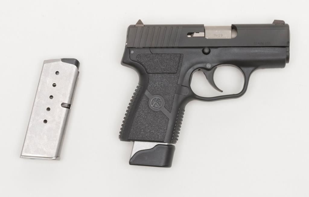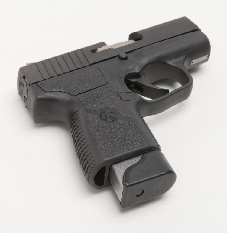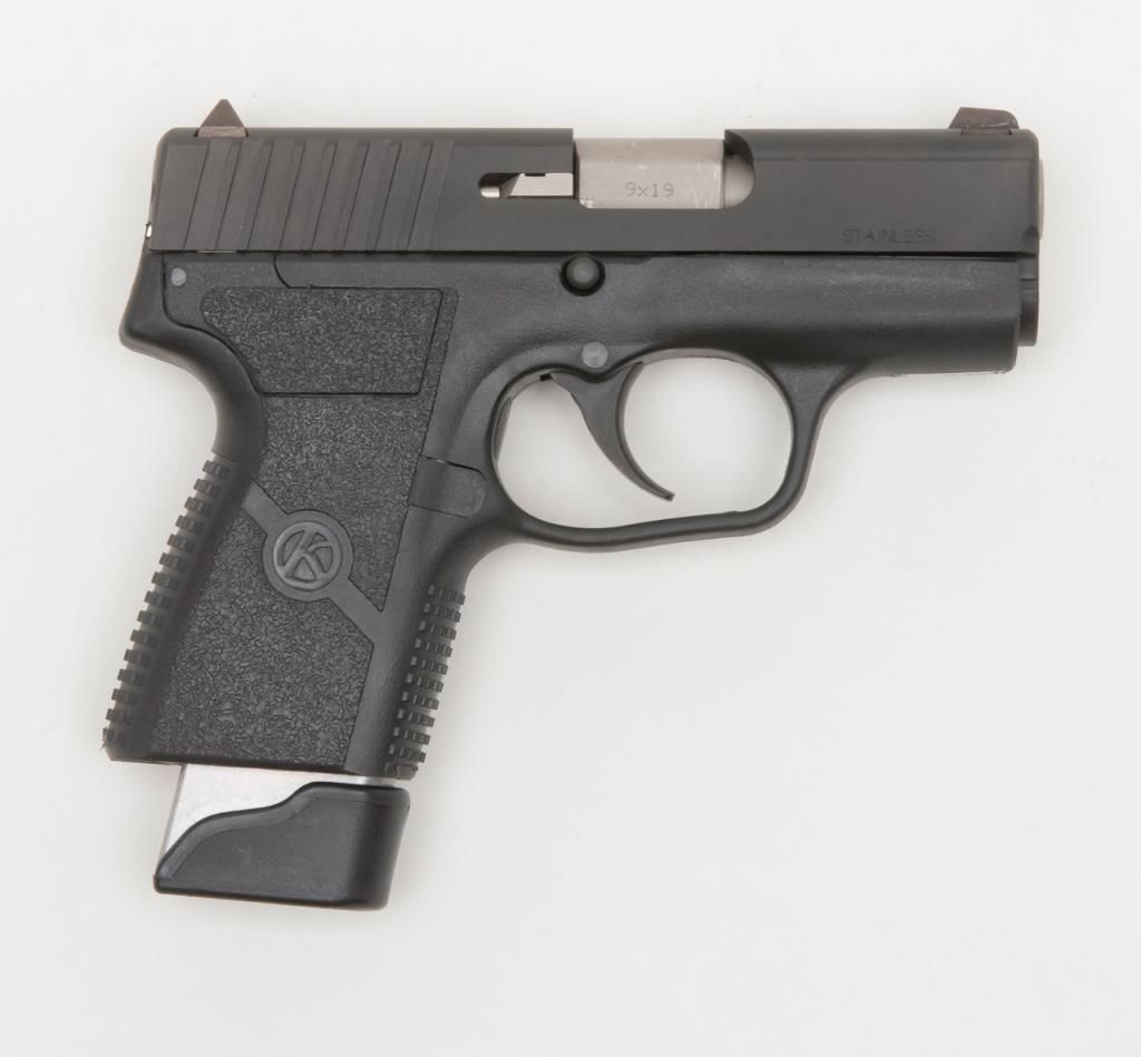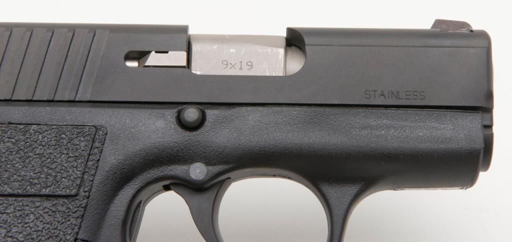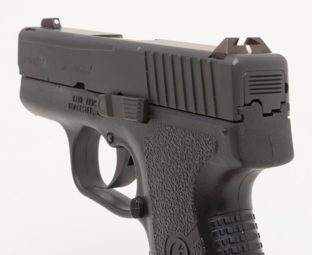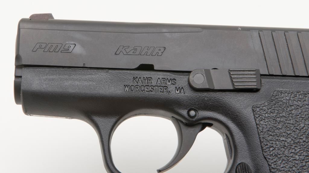 Kahr Model PM 9 compact semi-auto pistol, 9mm cal., 3” barrel, mat black finish, polymer frame, #VC9550 with extra magazine, in like new condition showing little use or handling. (Modern/No Sale to Calif. residents). Est.: $250-$500.
