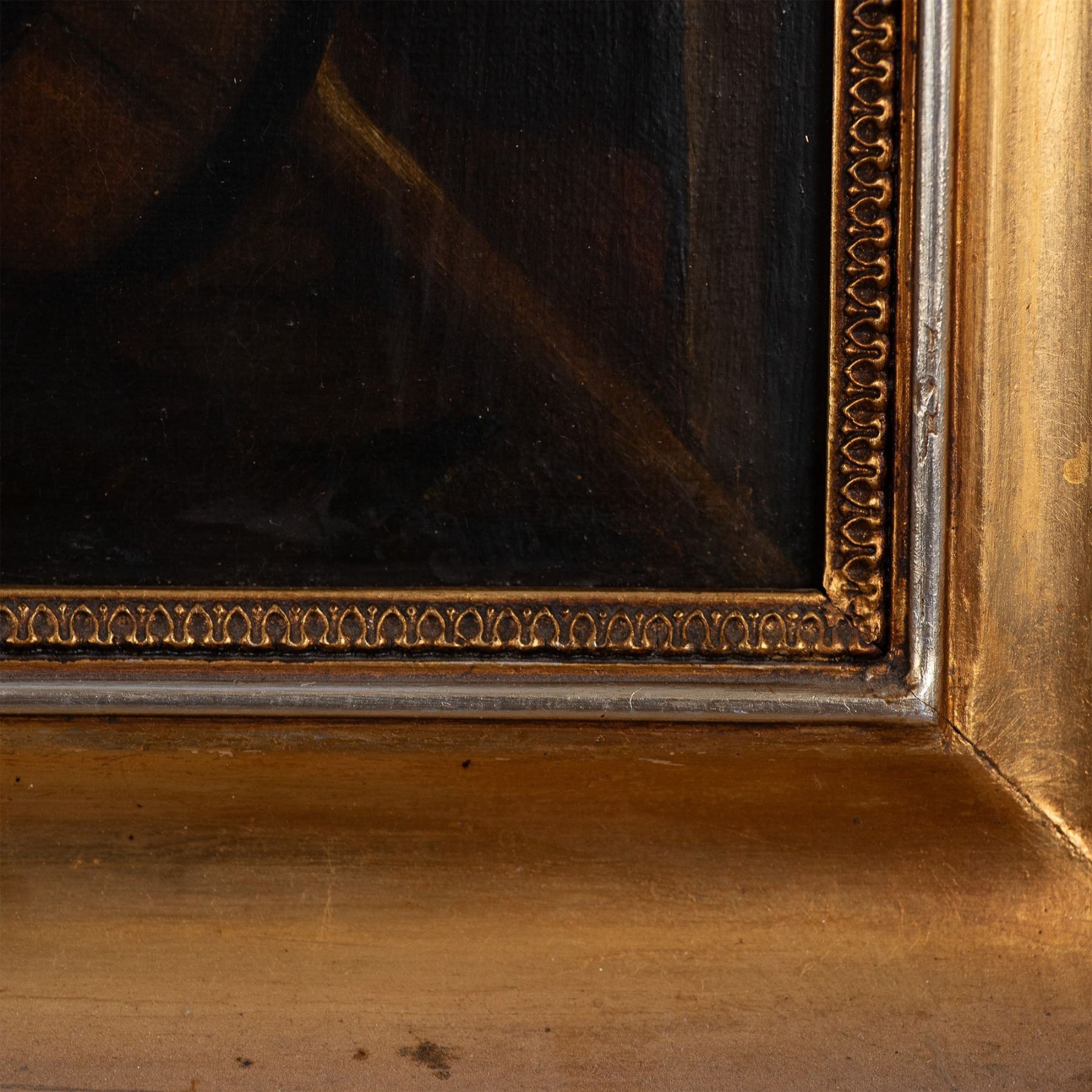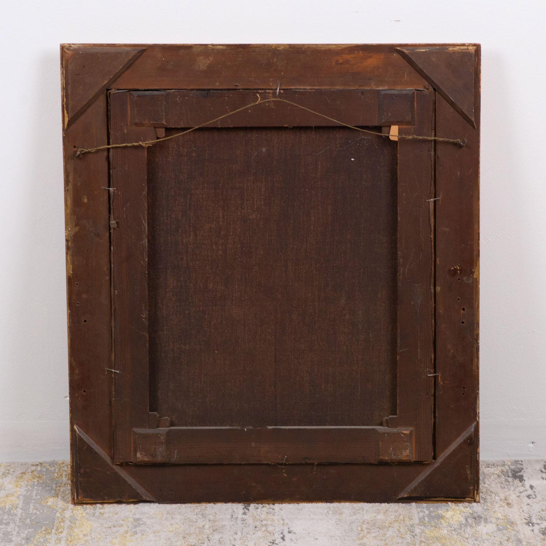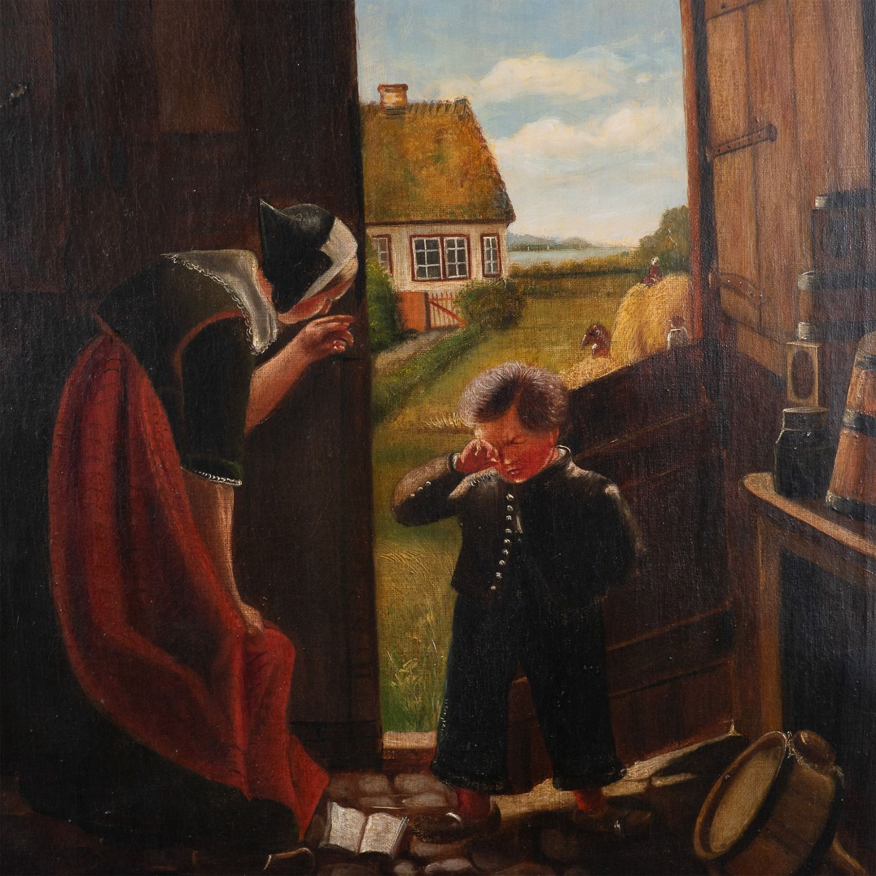 This charming oil on canvas genre scene, attributed to Danish artist Kay Jeppe Drews, captures an intimate moment in rural life. A young boy, caught in mischief, stands teary-eyed as an elder woman-possibly his mother-gestures firmly at him, her stance brimming with authority. The open doorway frames a serene countryside setting, contrasting the domestic tension with its pastoral calm. Housed in a gilded frame with delicate detailing. Artwork dimensions: 18"L x 21"H. Frame dimensions: 24"L x 27"H x 2"W.
