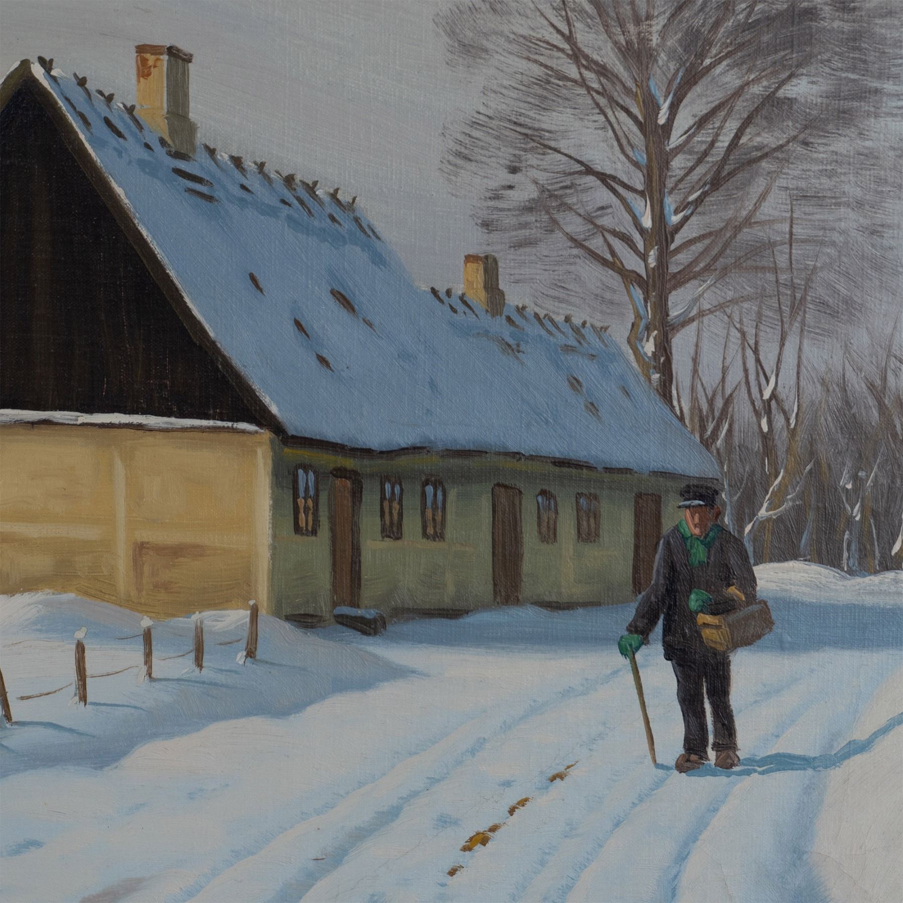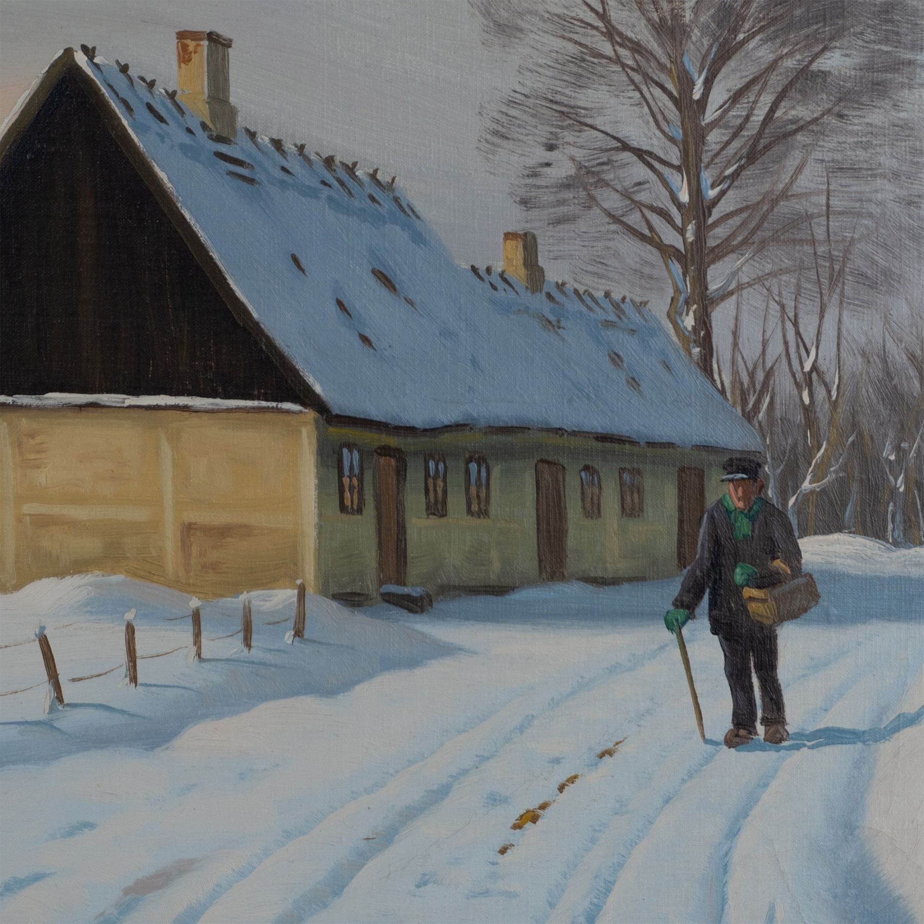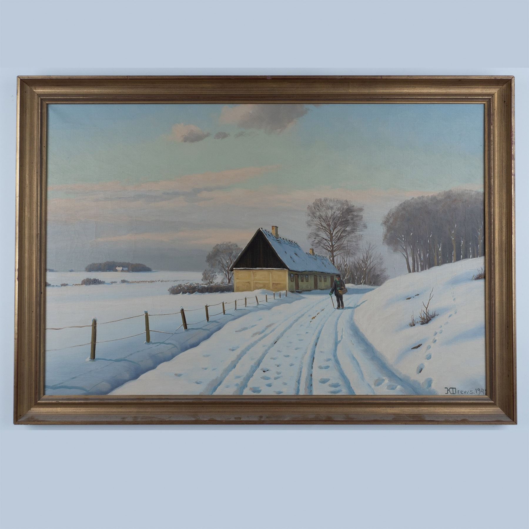 Winter is a captivating original oil on canvas by Danish artist Kai Drews, a student of renowned realist landscape painter Peder Mork Monsted (1859-1941). In this serene composition, Drews masterfully portrays a vast countryside blanketed in fresh snow. At its heart, an elderly man strolls leisurely along a quiet rural path, embodying the tranquil beauty of winter. Staying true to his mentor's realist style, Drews invites viewers into a scene rich in detail and atmosphere. Signature and date on lower right: 1941, K. Drews. Housed in a gilded wooden frame. Artwork dimensions: 34.50"L x 23.25"H. Frame dimensions: 39"L x 27.25"H x 1.50"W.