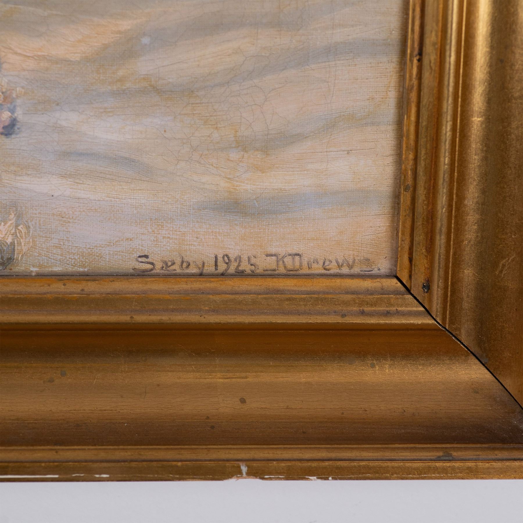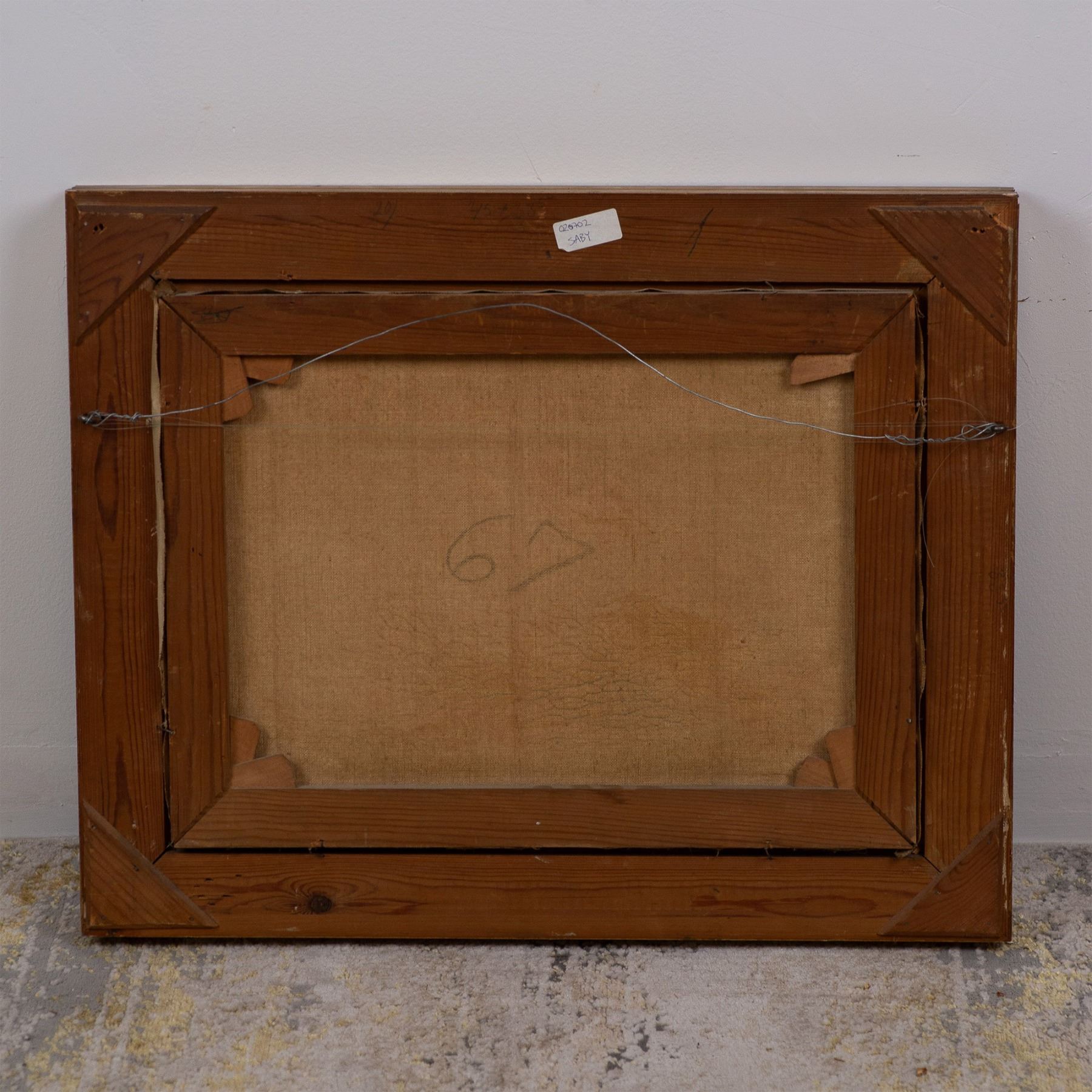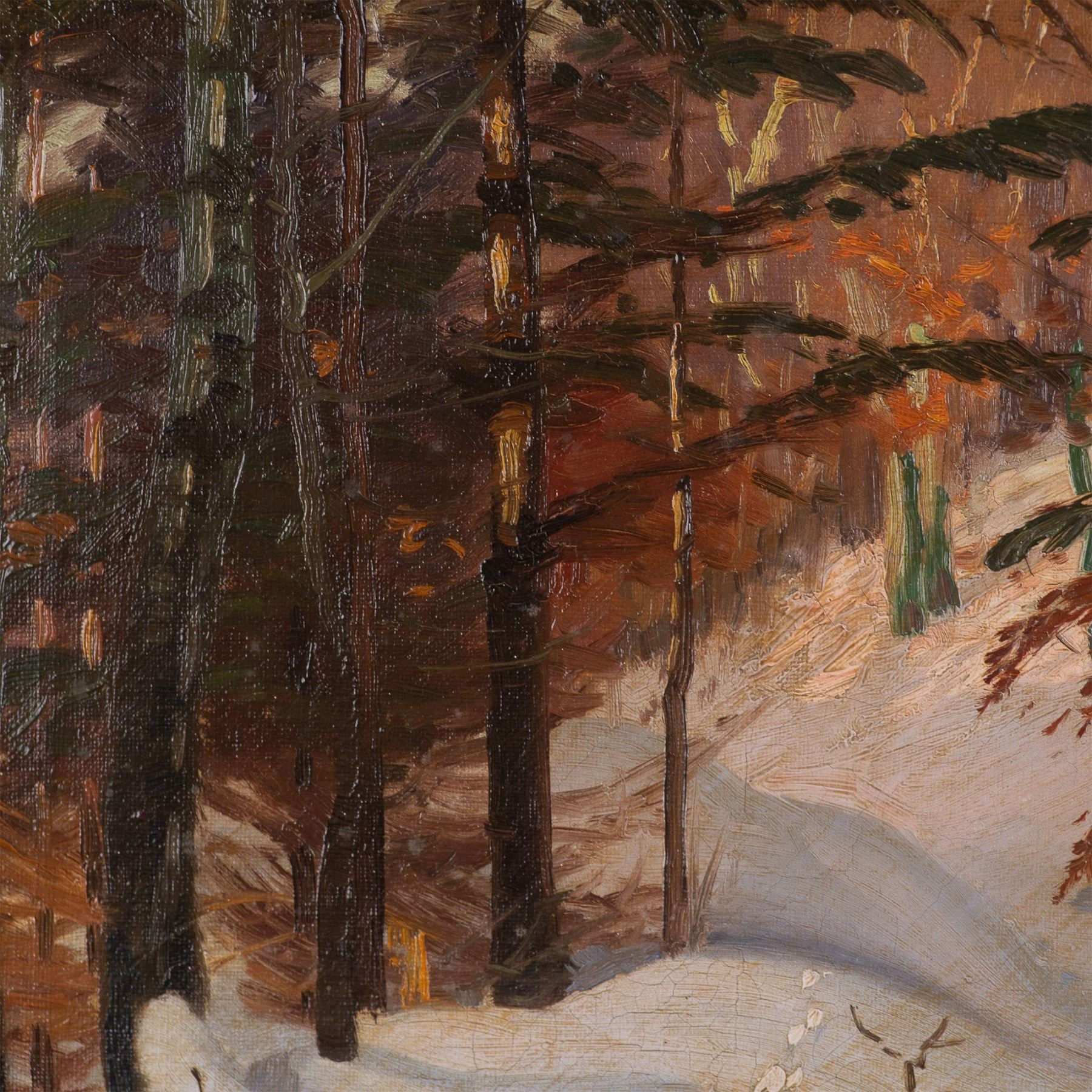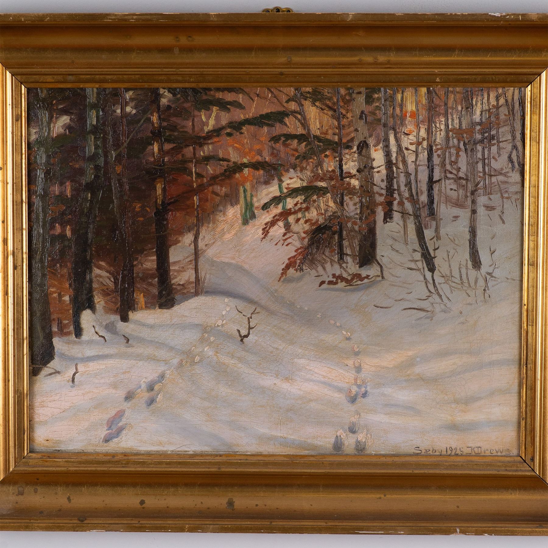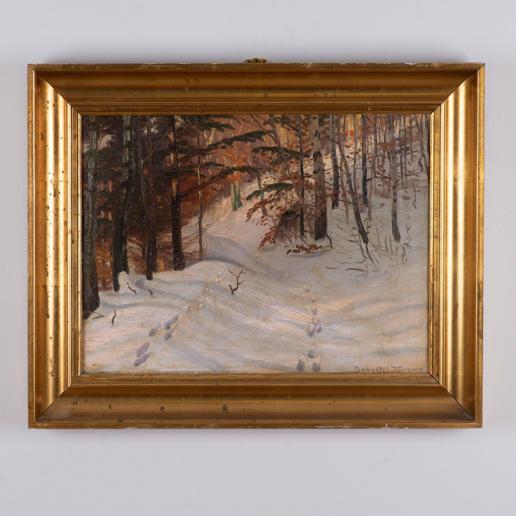This evocative oil painting by Danish artist Kai Jeppe Drews (1904-1993) captures the serene beauty of a winter forest. The artwork depicts a snow-covered trail weaving through a dense woodland, with soft footprints trailing off into the distance. Drews masterfully renders the interplay of light and shadow, bringing the quiet stillness of a snow-laden forest to life. The muted color palette and delicate brushstrokes reflect Drews' ability to convey the tranquil yet raw power of nature in his work. The gold-tone frame enhances the artwork's understated elegance, making it a compelling piece for collectors of Scandinavian art. Location, signature and date on lower right: Saeby 1925 J Drews. Housed in a gilded wooden frame. Artwork dimensions: 17.75"L x 13"H. Frame dimensions: 23"L x 18.50"H x 2"W.
