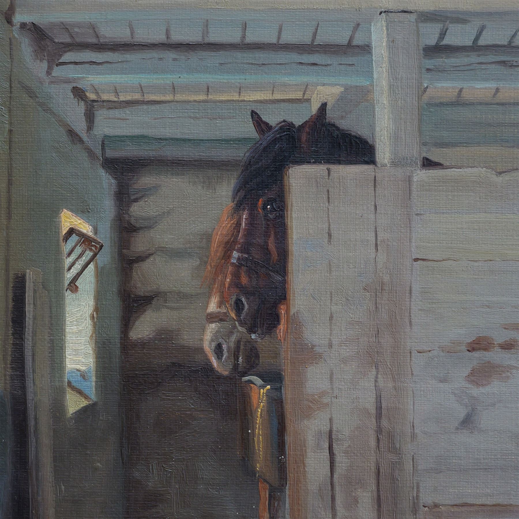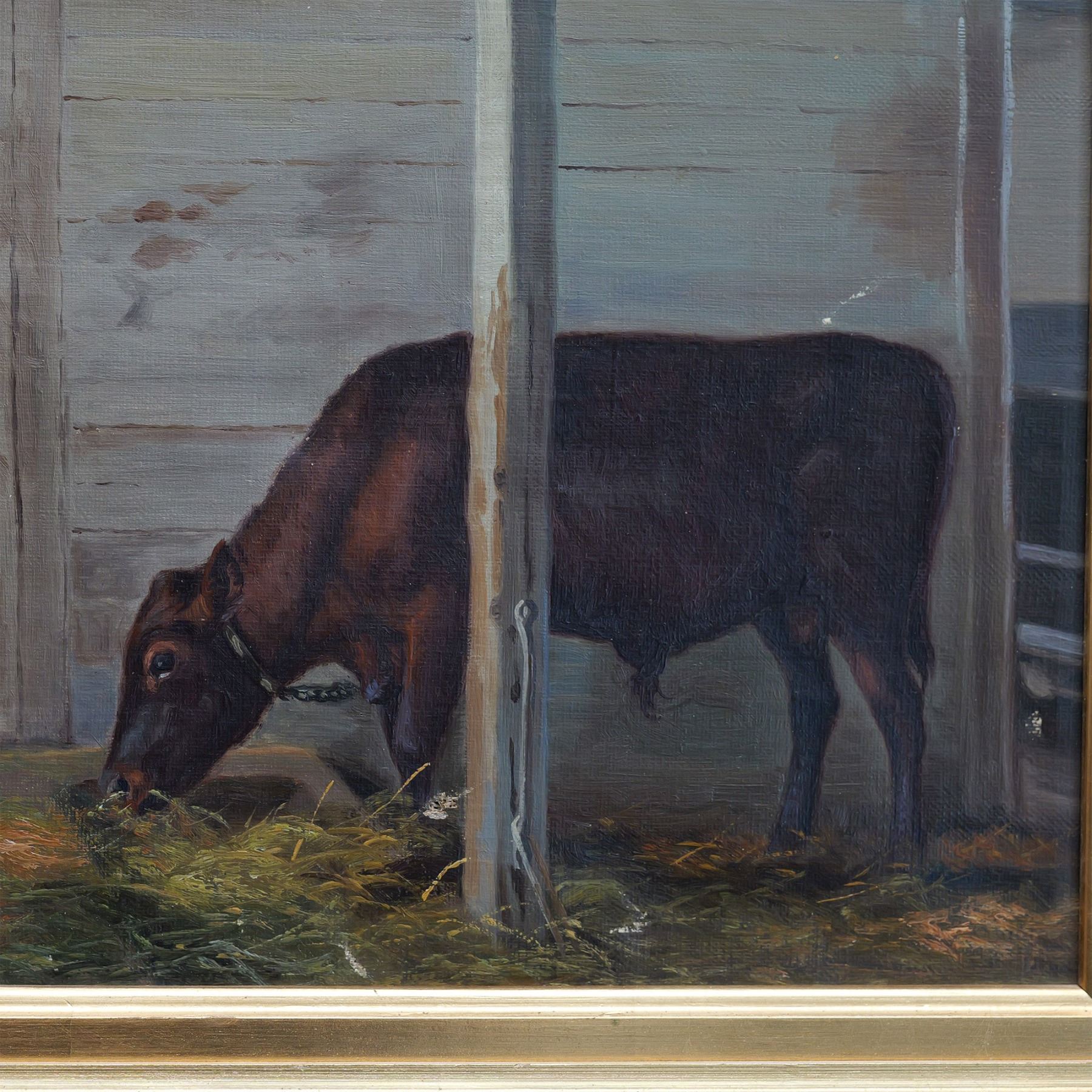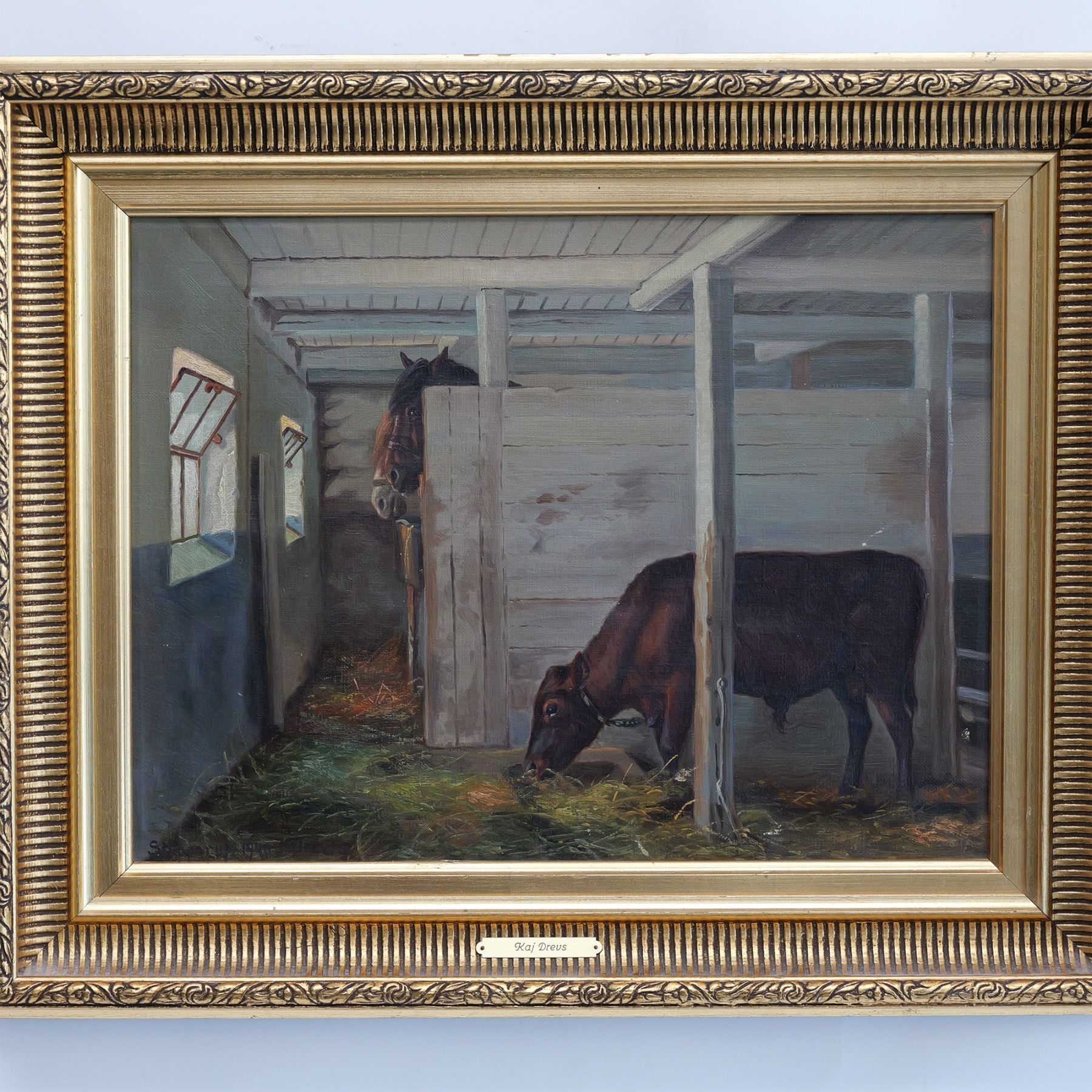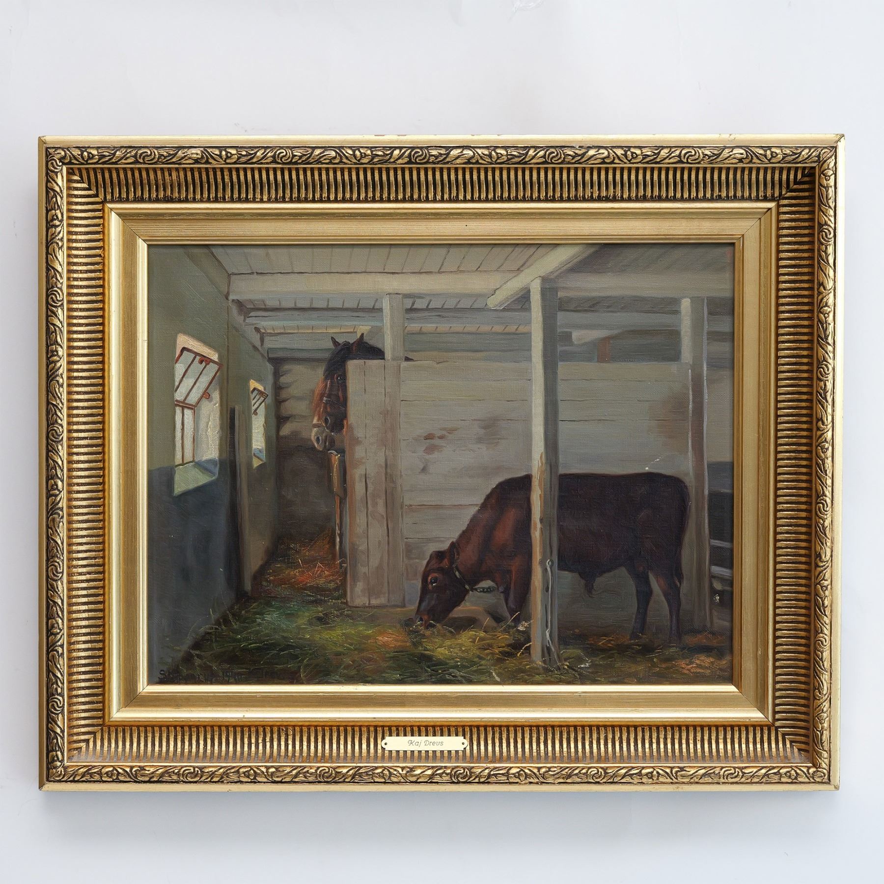 An exquisite original oil on canvas by Danish artist Kai Jeppe Drews, depicting a serene scene of two horses and a cow nestled within a rustic wooden interior. Sunlight pours softly through partially open windows, casting a warm, golden glow that enhances the composition's tranquil beauty and timeless charm. Location, date and signature on lower left: Stupperup 1940 K. Drews. Includes a plaque with artist's name on frame: Kaj Dreus. Housed in a gilded frame. Artwork dimensions: 19"L x 14"H. Frame dimensions: 26"L x 21"H x 2.25"W.