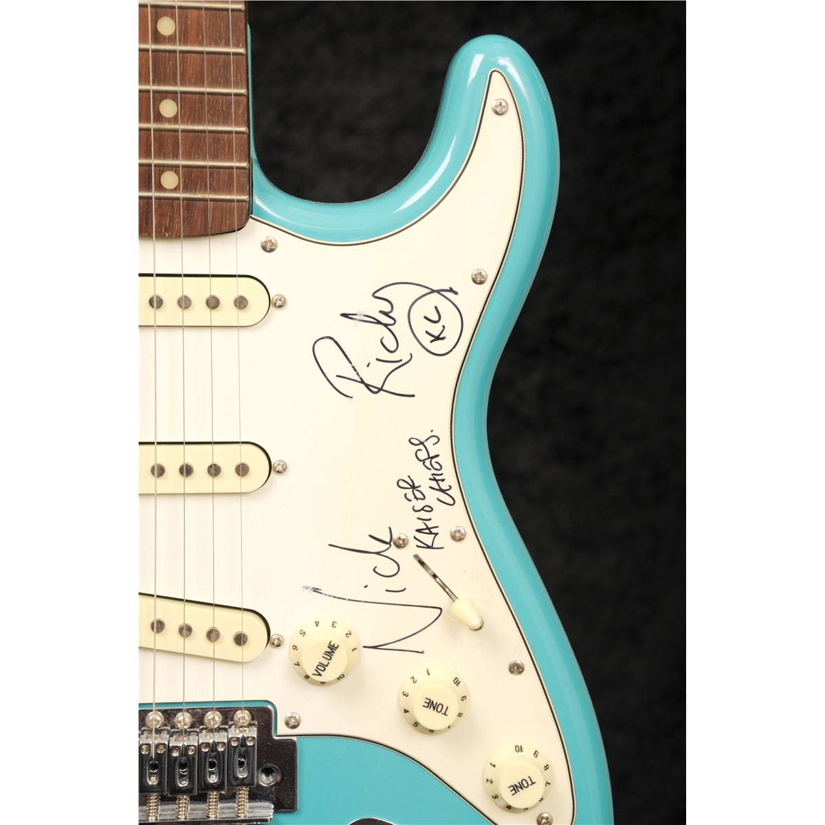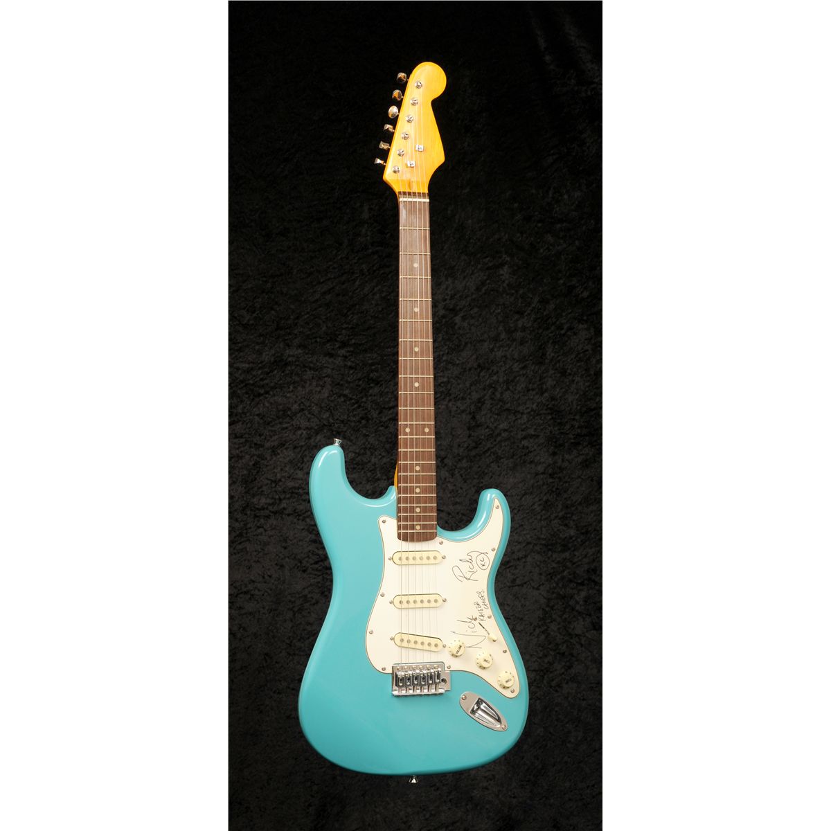 and Nick Baines, a Stratocaster style guitar with lake placid blue finish, signed on the scratchplate by Ricky Wilson and Nick Baines in black marker