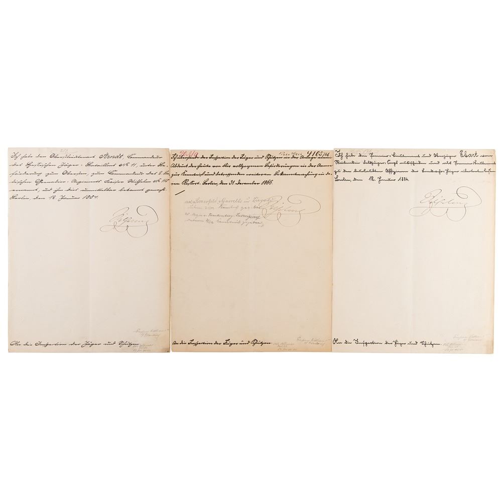 Three manuscript DSs in German, each signed “Wilhelm,” one page, 9 x 11, dated from 1866 to 1884. Three untranslated official documents, each signed at the conclusion by Wilhelm I as King of Prussia. In overall fine condition.