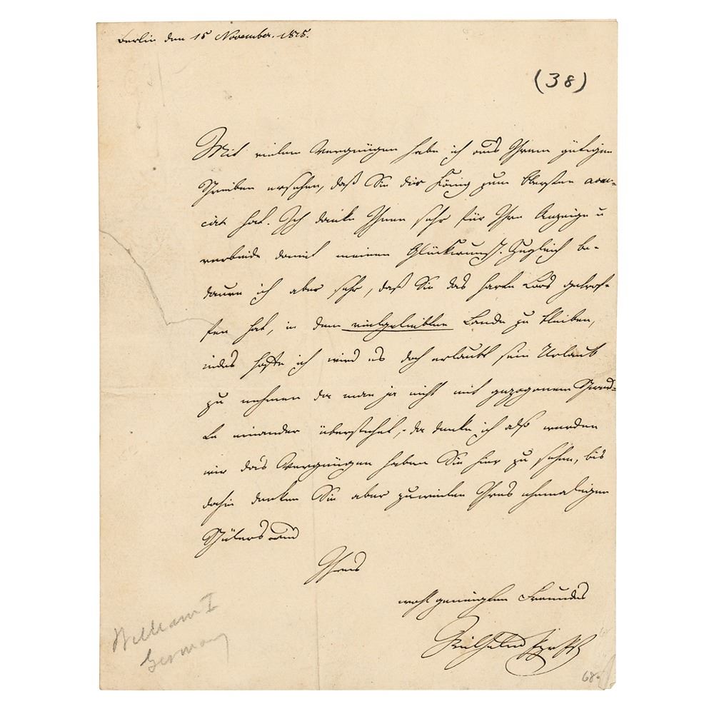 King of Prussia (born 1797) from 1861 and first Emperor of Germany from 1871 until his death in 1888; a member of the House of Hohenzollern, he was the first head of state of a united Germany. ALS in German, one page, 6.25 x 8.25, November 15, 1875. Untranslated handwritten letter by the German emperor. In very good to fine condition, with light wrinkling and a repaired tear to the left side.